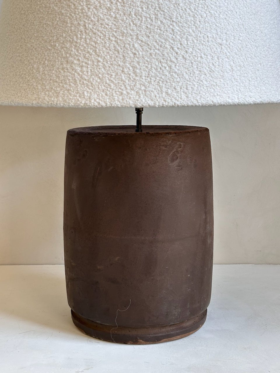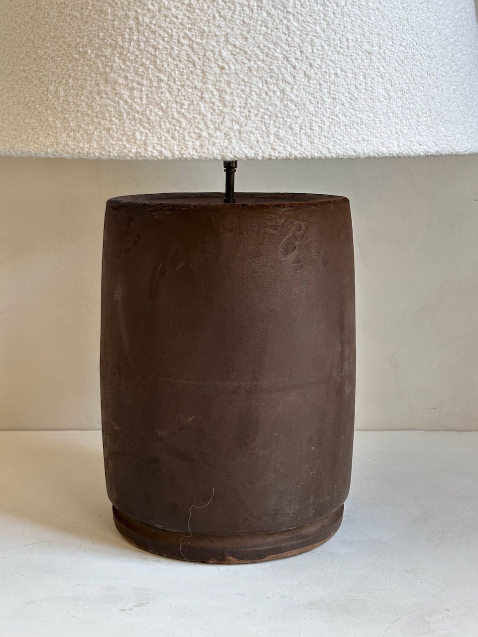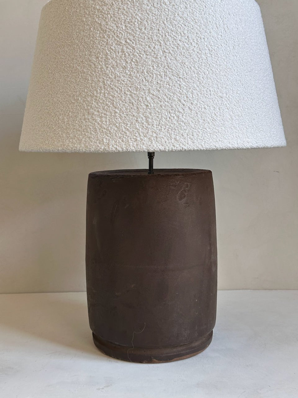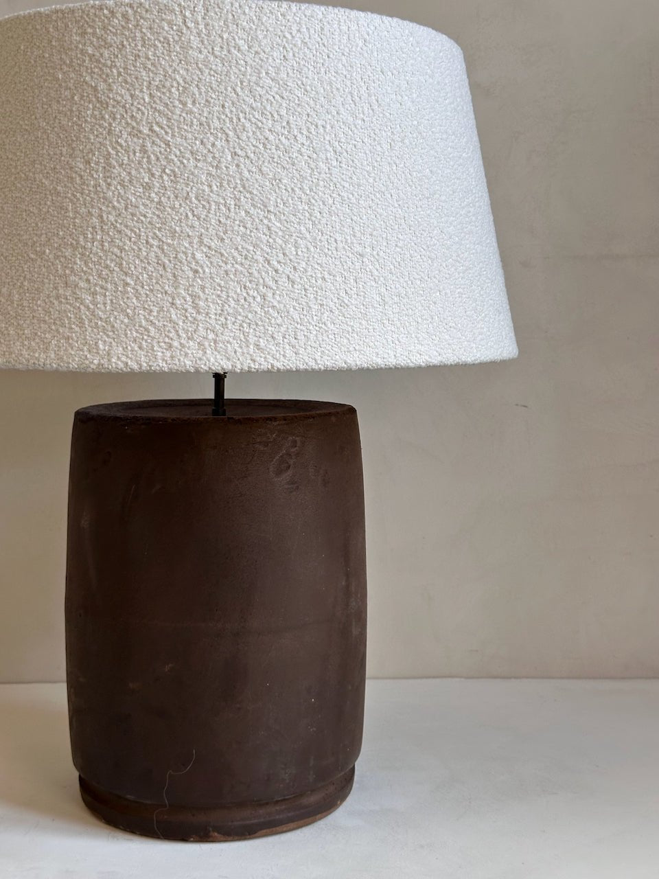 This lamp is made from an antique clay pot originating from the Shanxi province of China, dating to the 1970s. Originally used for storing oil or water, these rustic vessels feature a beautiful patina and make for unique table lamps. Here, it has been paired with a bouclé wool shade to create a distinctive, one-of-a-kind piece.
