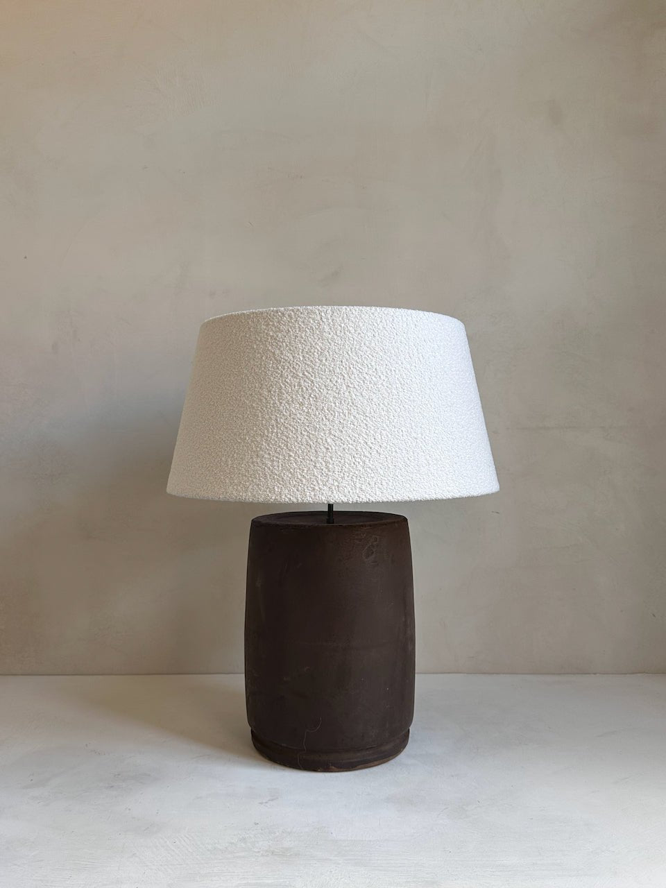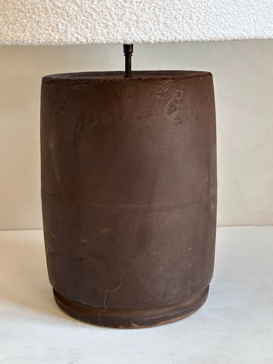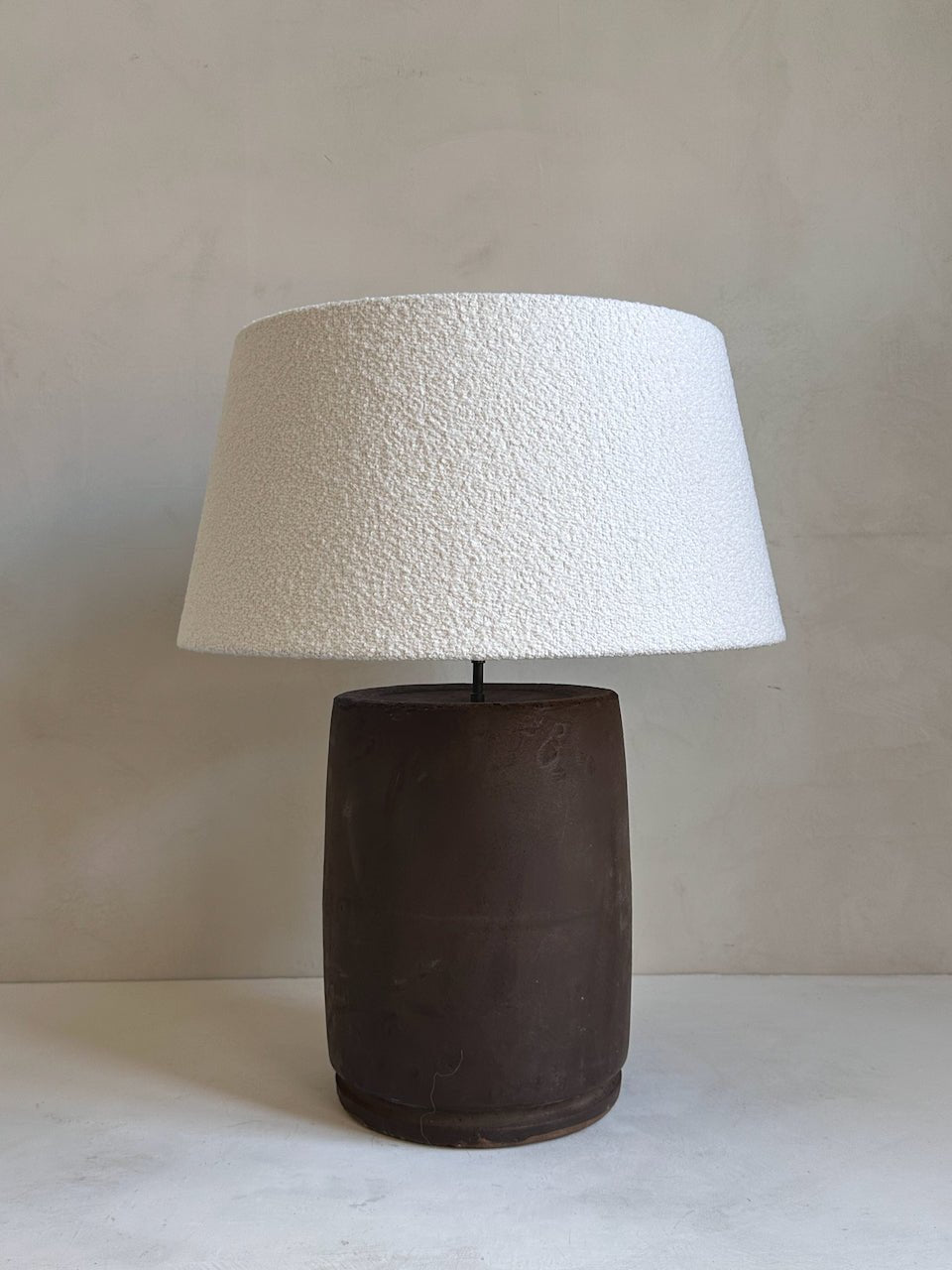 This lamp is made from an antique clay pot originating from the Shanxi province of China, dating to the 1970s. Originally used for storing oil or water, these rustic vessels feature a beautiful patina and make for unique table lamps. Here, it has been paired with a bouclé wool shade to create a distinctive, one-of-a-kind piece.