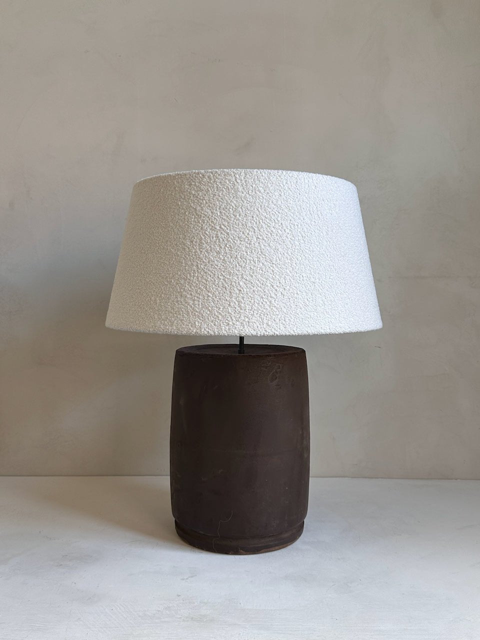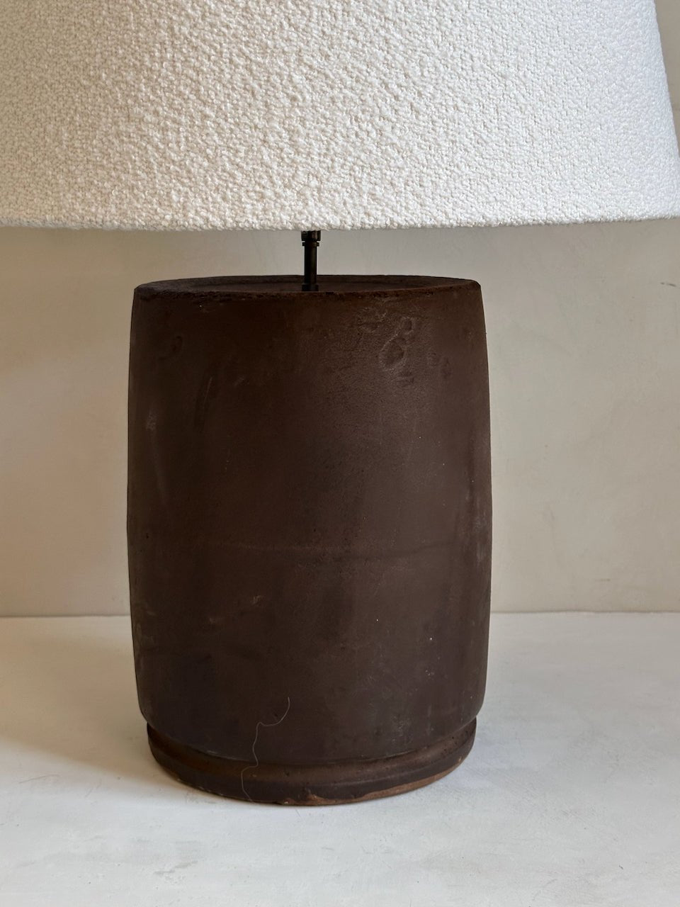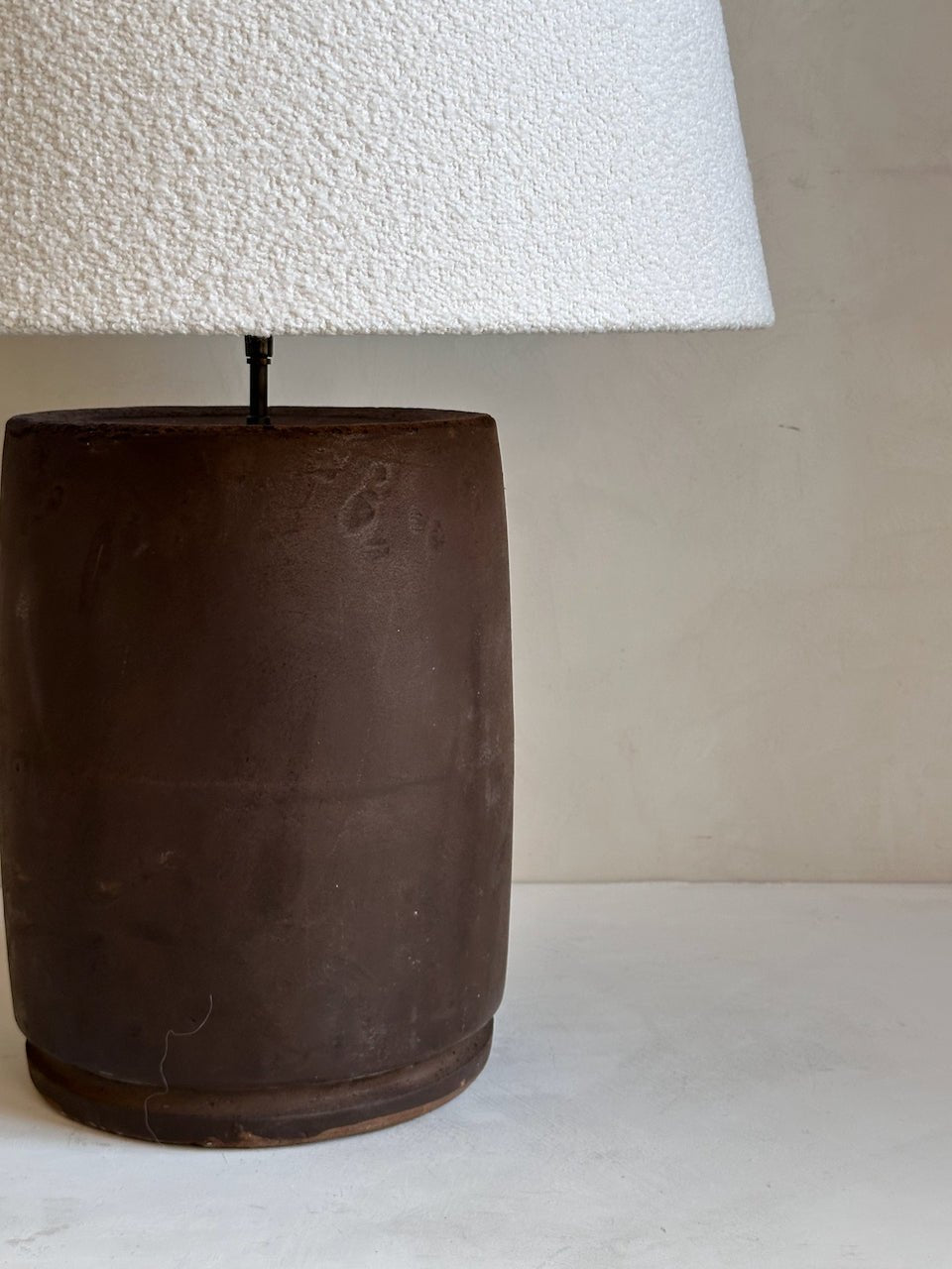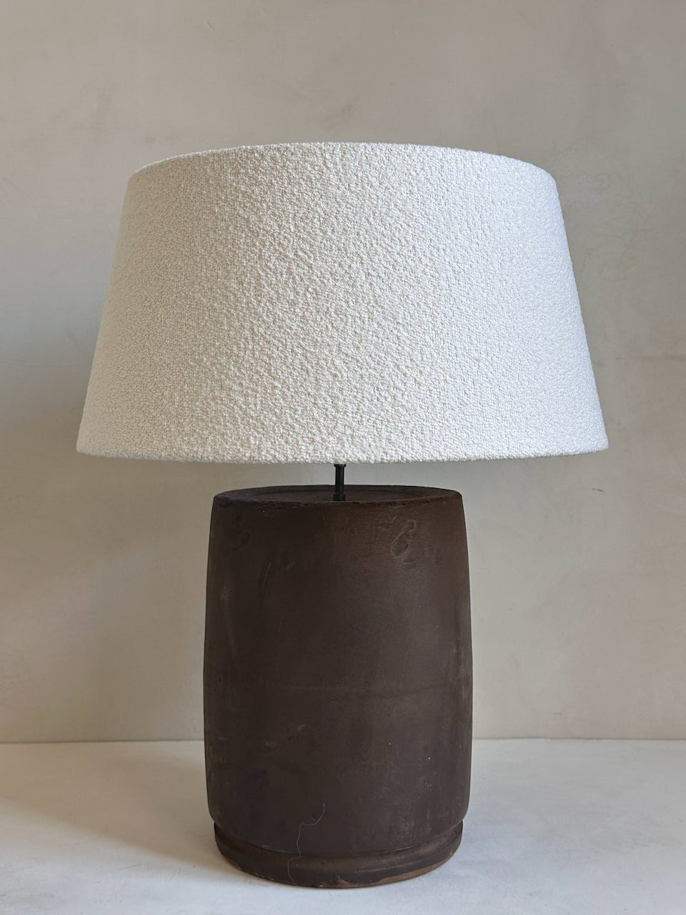 This lamp is made from an antique clay pot originating from the Shanxi province of China, dating to the 1970s. Originally used for storing oil or water, these rustic vessels feature a beautiful patina and make for unique table lamps. Here, it has been paired with a bouclé wool shade to create a distinctive, one-of-a-kind piece.