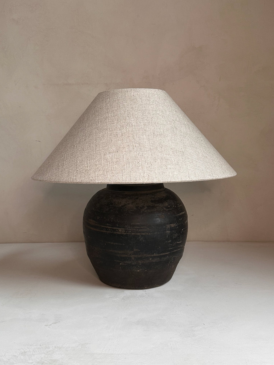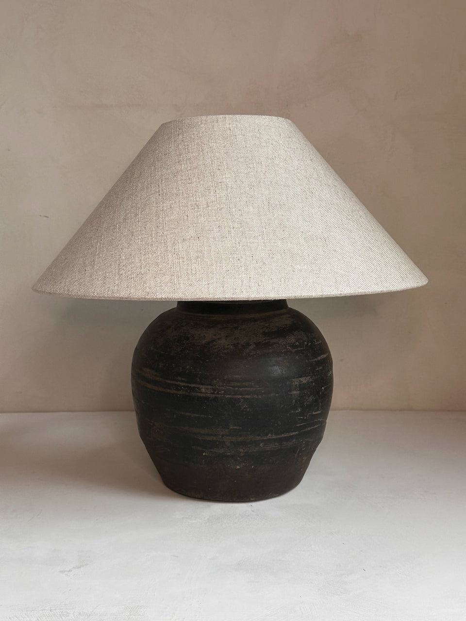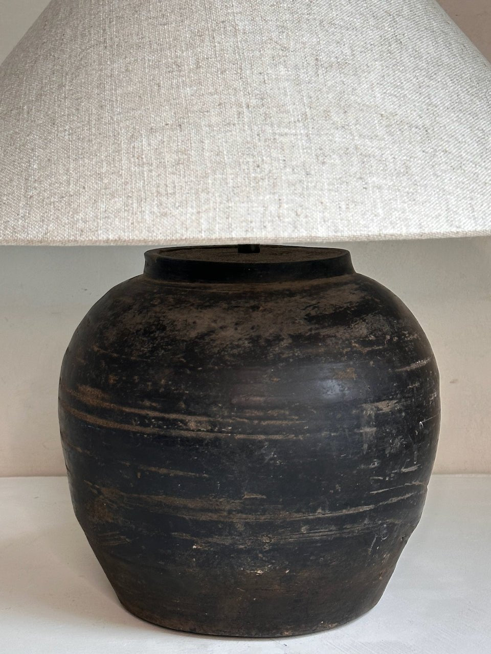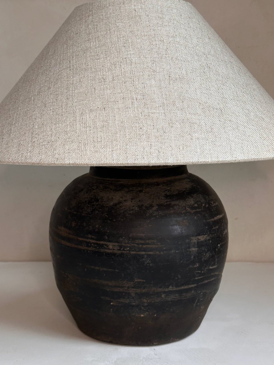This lamp is made from an antique clay pot originating from the Shanxi province of China, dating to the 1970s. Originally used for storing oil or water, these rustic vessels feature a beautiful patina and make for unique table lamps. Here, it has been paired with a natural linen shade to create a distinctive, one-of-a-kind piece.