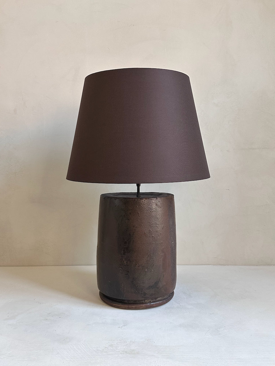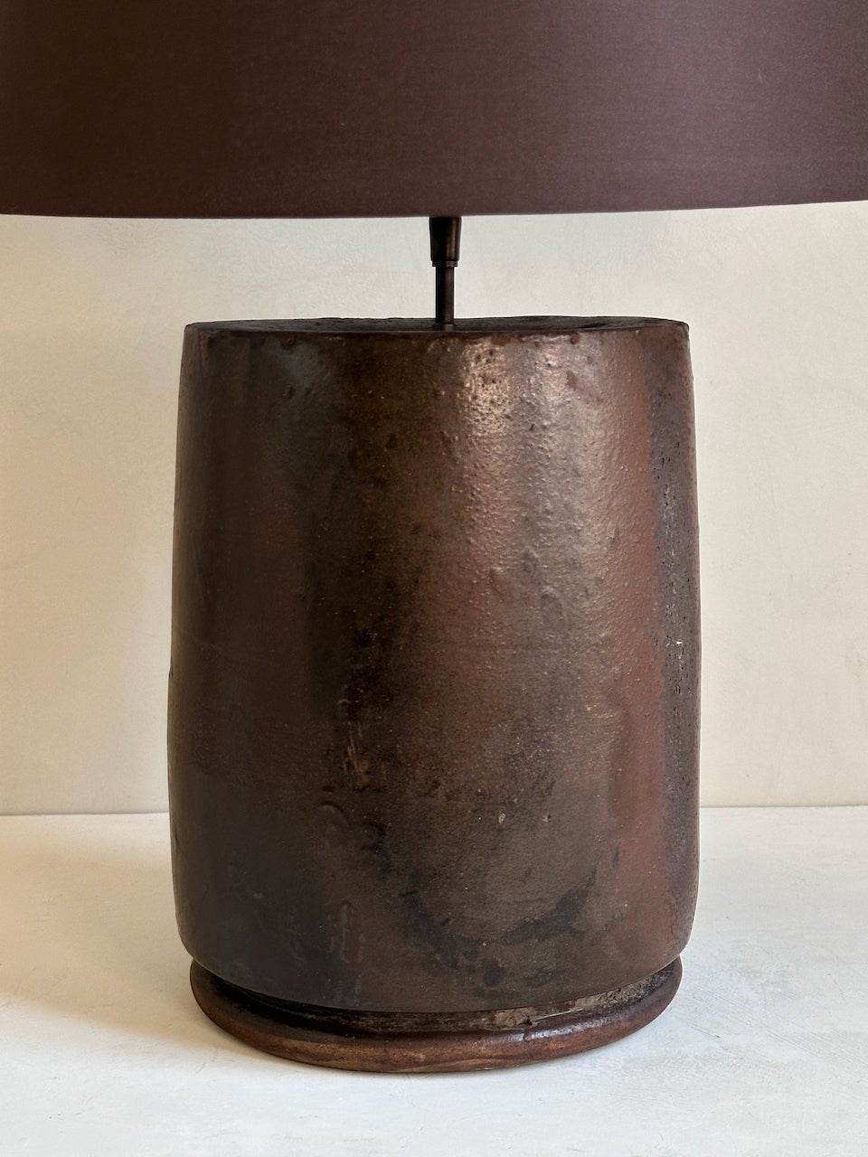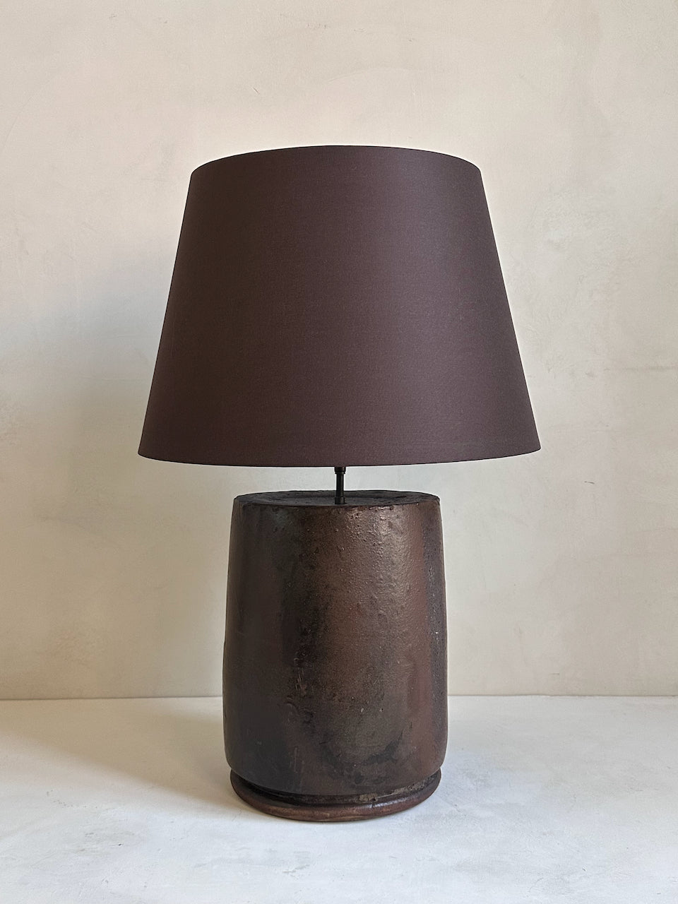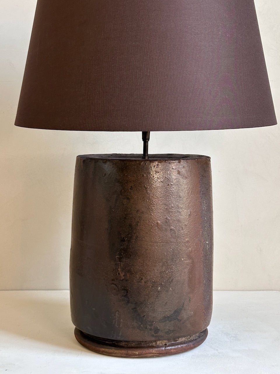 This lamp is made from an antique clay pot originating from the Shanxi province of China, dating to the 1970s. Originally used for storing oil or water, these rustic vessels feature a beautiful patina and make for unique table lamps. Here, it has been paired with a chocolate shade to create a distinctive, one-of-a-kind piece.