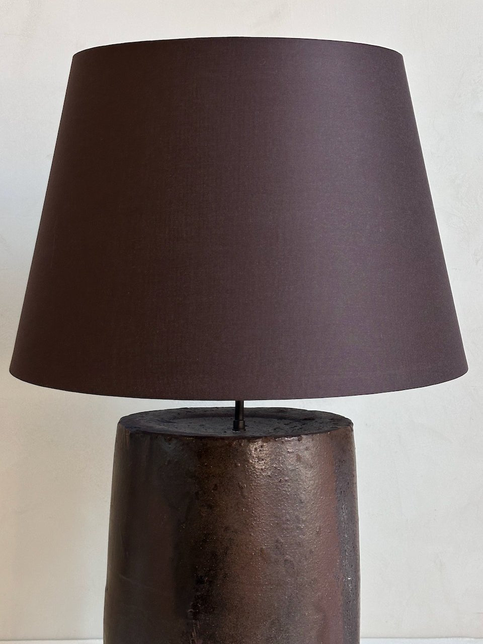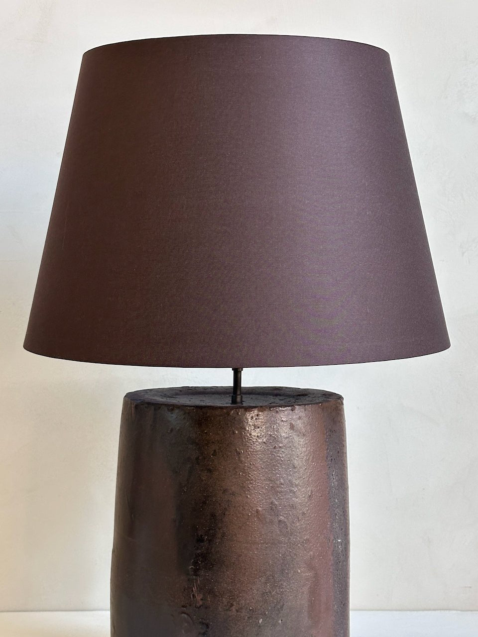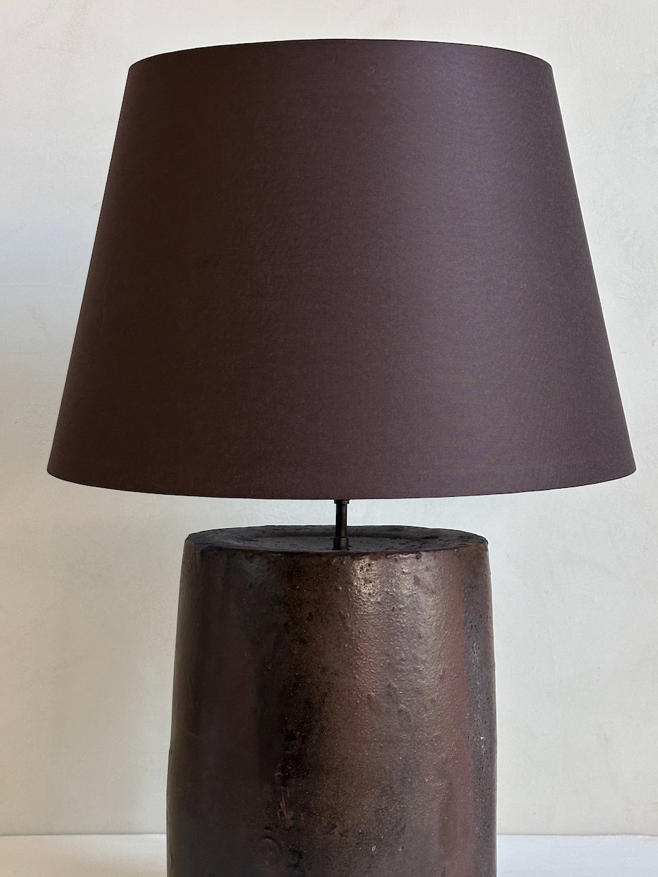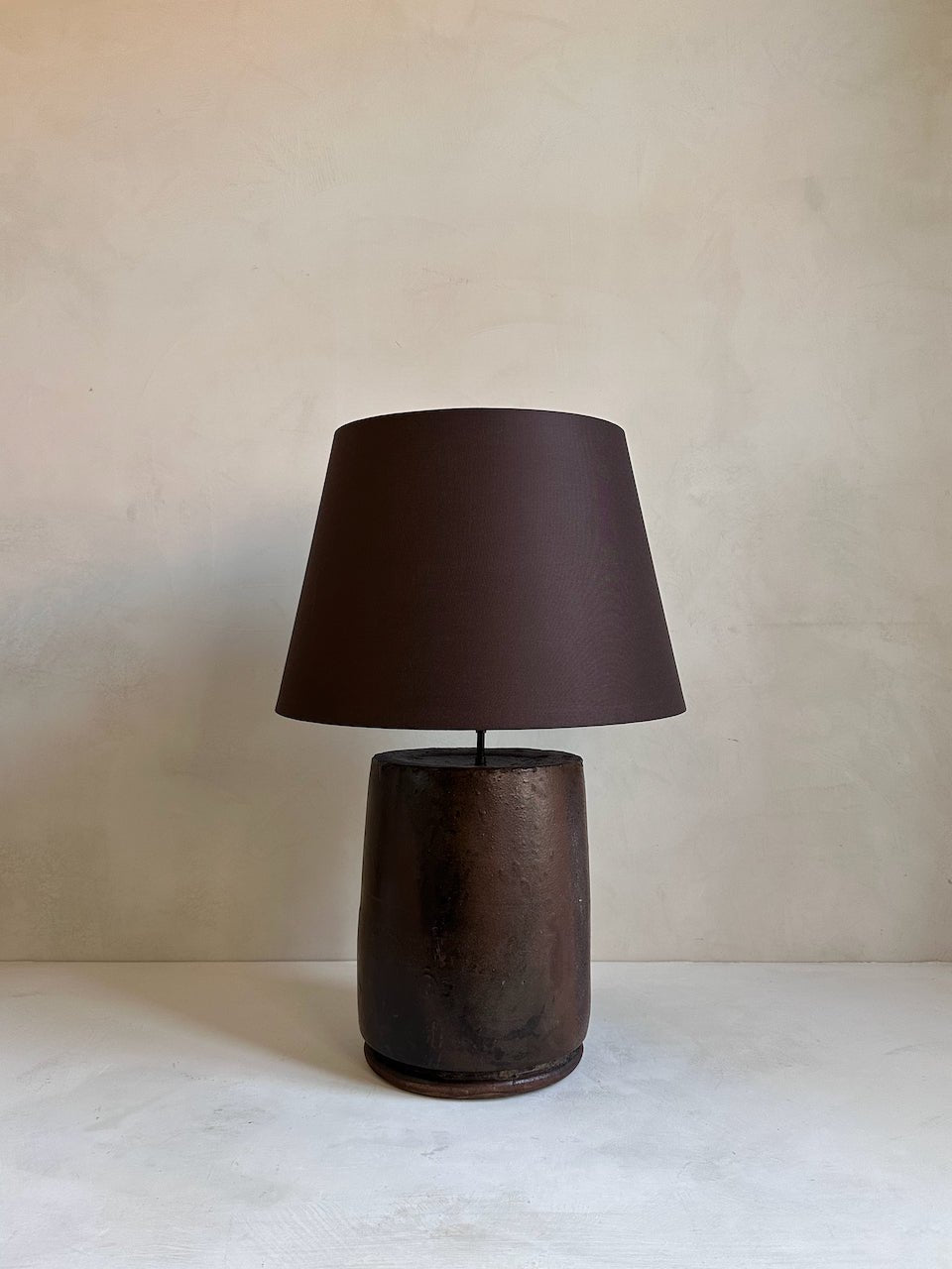 This lamp is made from an antique clay pot originating from the Shanxi province of China, dating to the 1970s. Originally used for storing oil or water, these rustic vessels feature a beautiful patina and make for unique table lamps. Here, it has been paired with a chocolate shade to create a distinctive, one-of-a-kind piece.