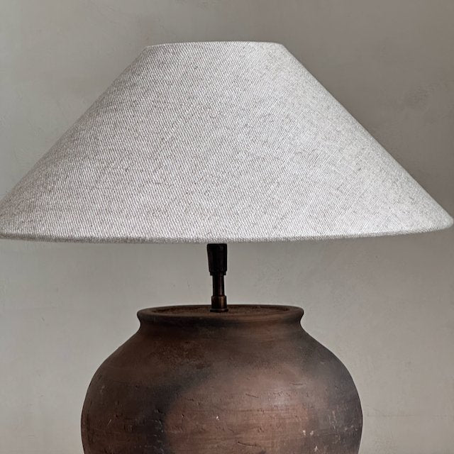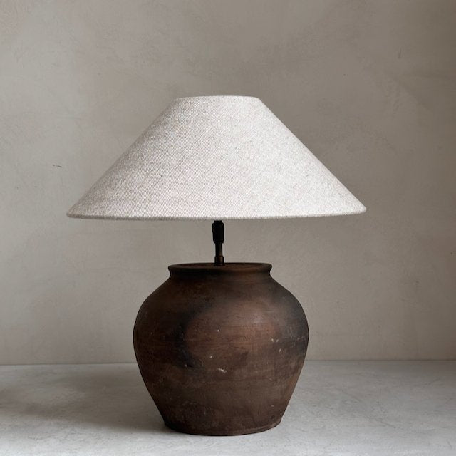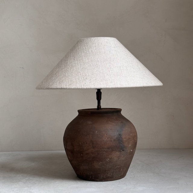 This antique clay pot is from the Shanxi province in China and dates back to the 1970’s. These rustic pots were used for storing oil and water. With their beautiful patina they make for unique table lamps. Here it has been combined with a natural linen shade.