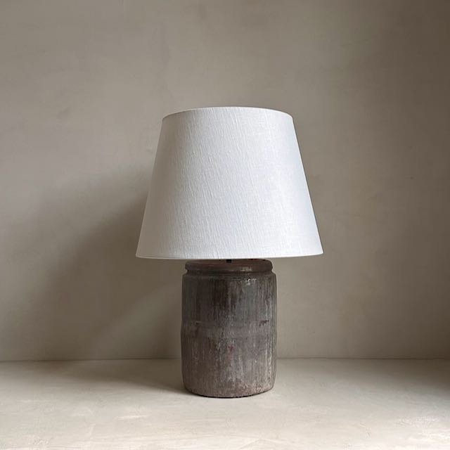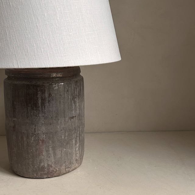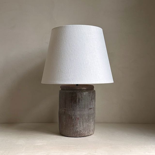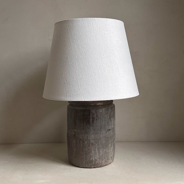 This antique clay pot is from the Shanxi province in China and dates back to the 1970’s. These rustic pots were used for storing oil and water. With their beautiful patina they make for unique table lamps. Here it has been combined with a natural linen shade.