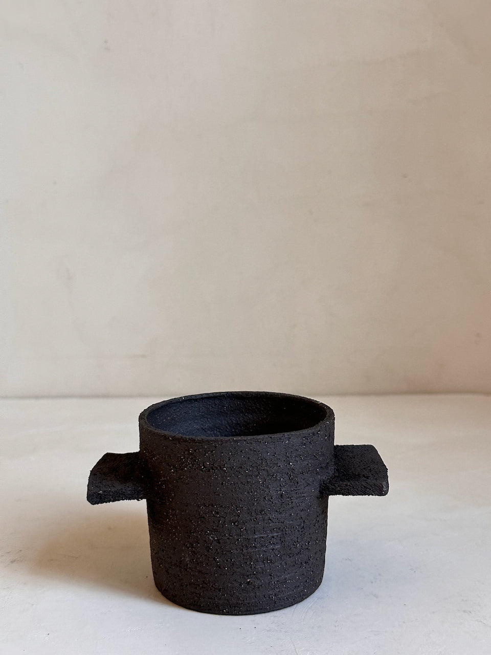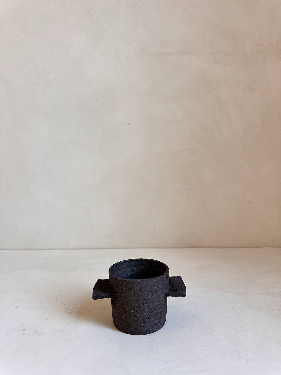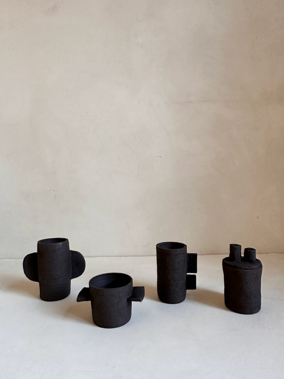 Their surfaces are left raw and tactile, revealing the natural grain of the clay and the traces of the making process. These are decorative objects, conceived as small architectural forms for a shelf, a console or a quiet corner of a room. They are not intended for water or flowers; instead they stand on their own as simple, grounded shapes that bring a sense of calm and materiality to a space.