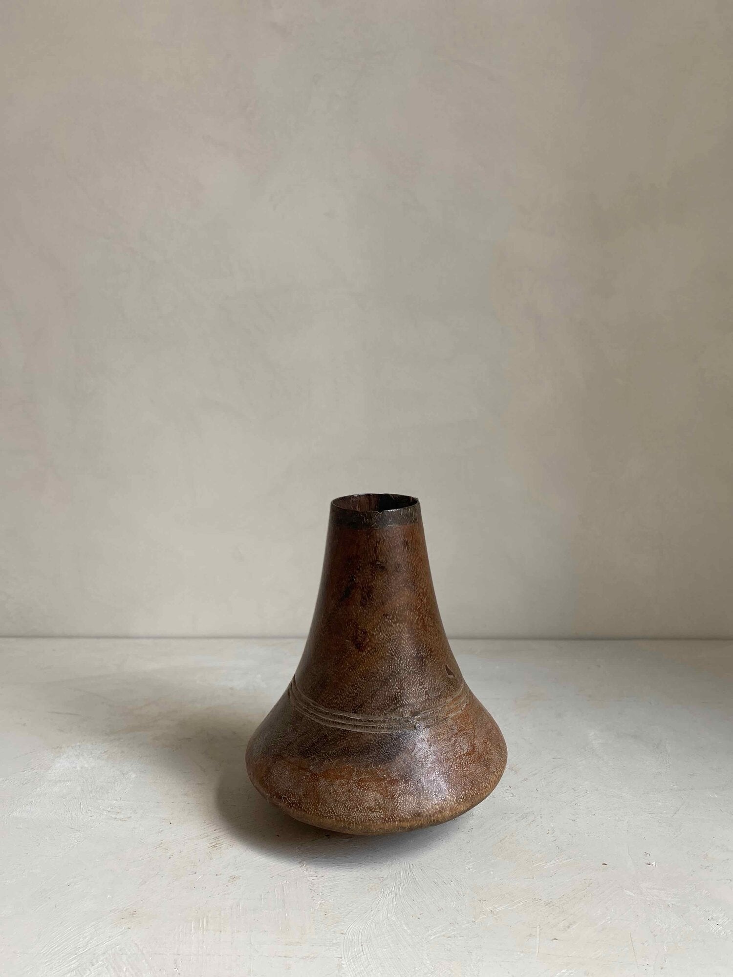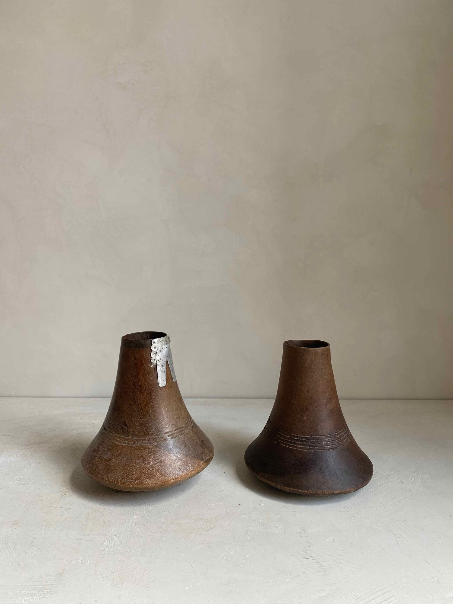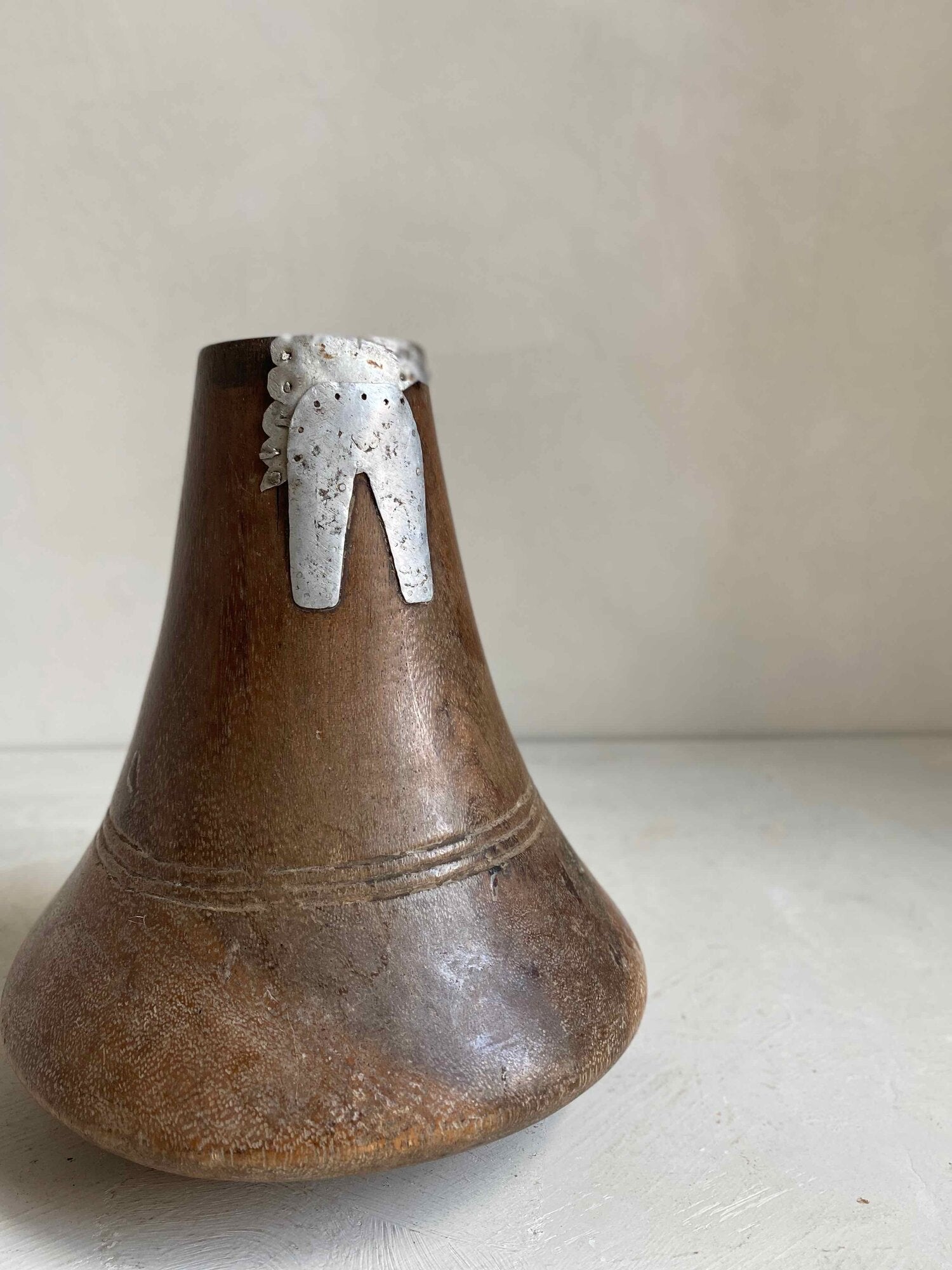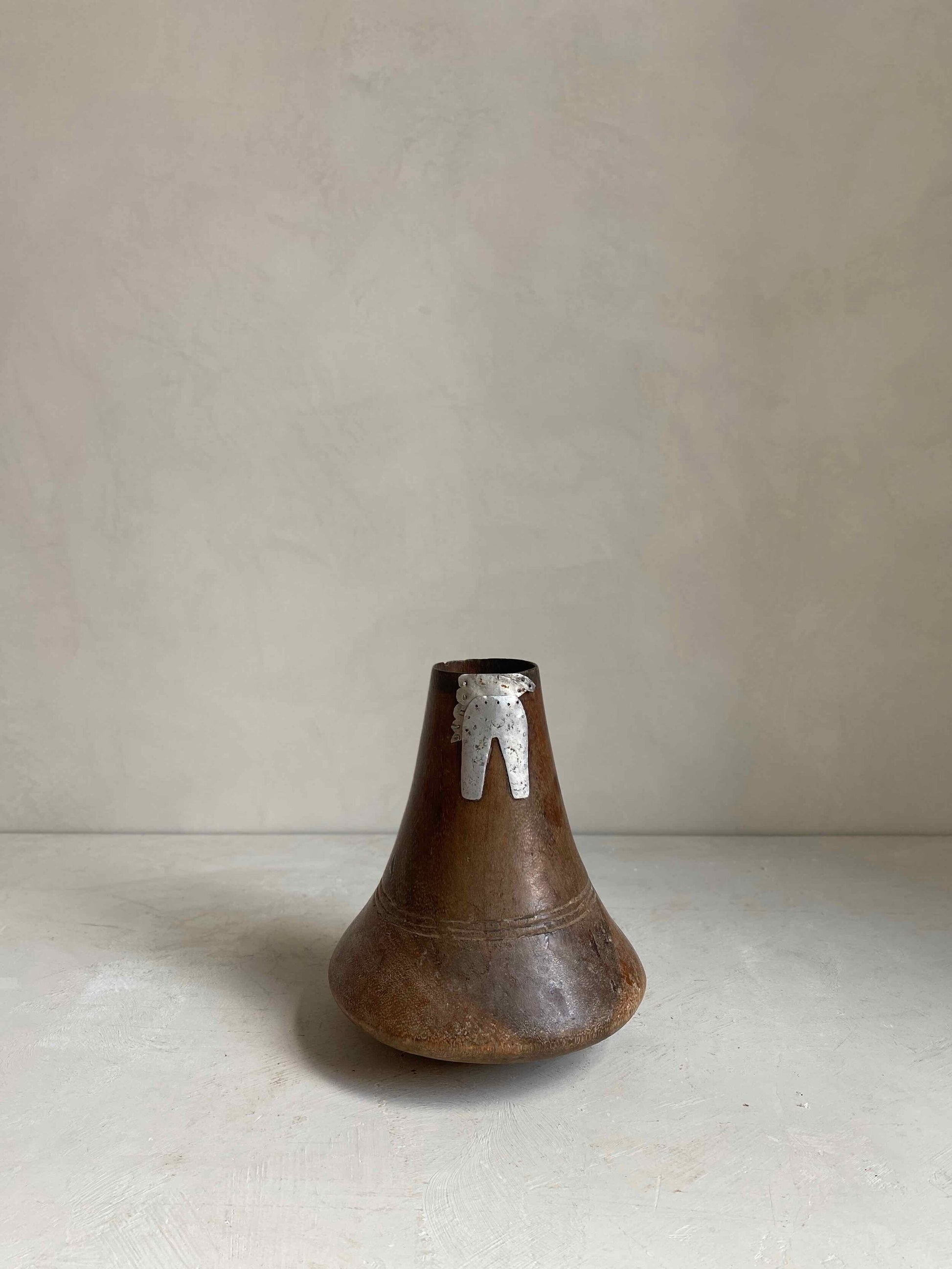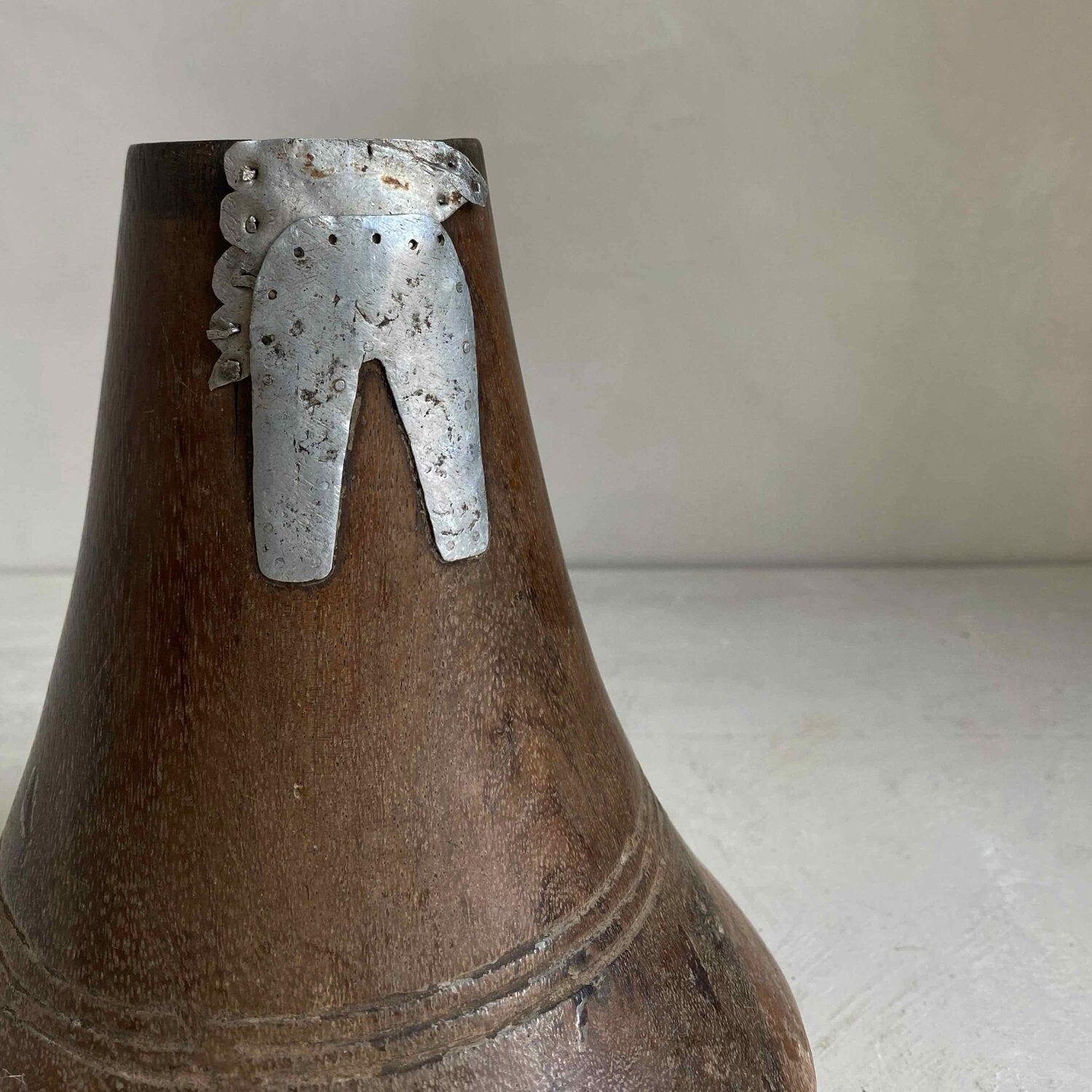 Carved wooden gourde from the first half of the 20th Century. Originates from Cameroon. This gourde has been repaired with a beautiful metal detail adding to it’s uniqueness.