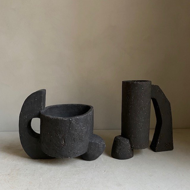 Pascale works with white and black clay, in their raw state with stone effects, giving them a stony rendering and feel. She is intrigued by the shape of the void and gives as much importance to