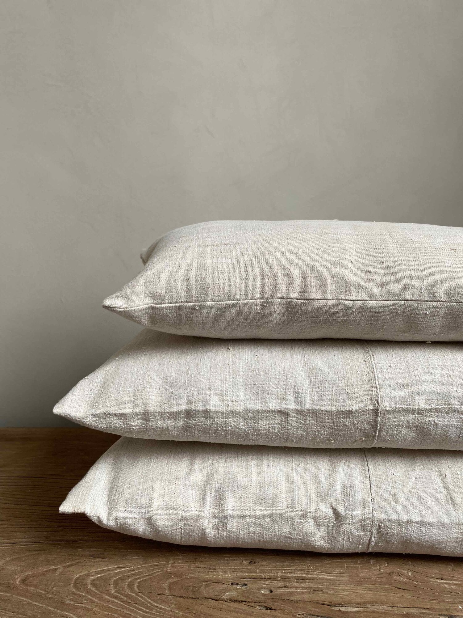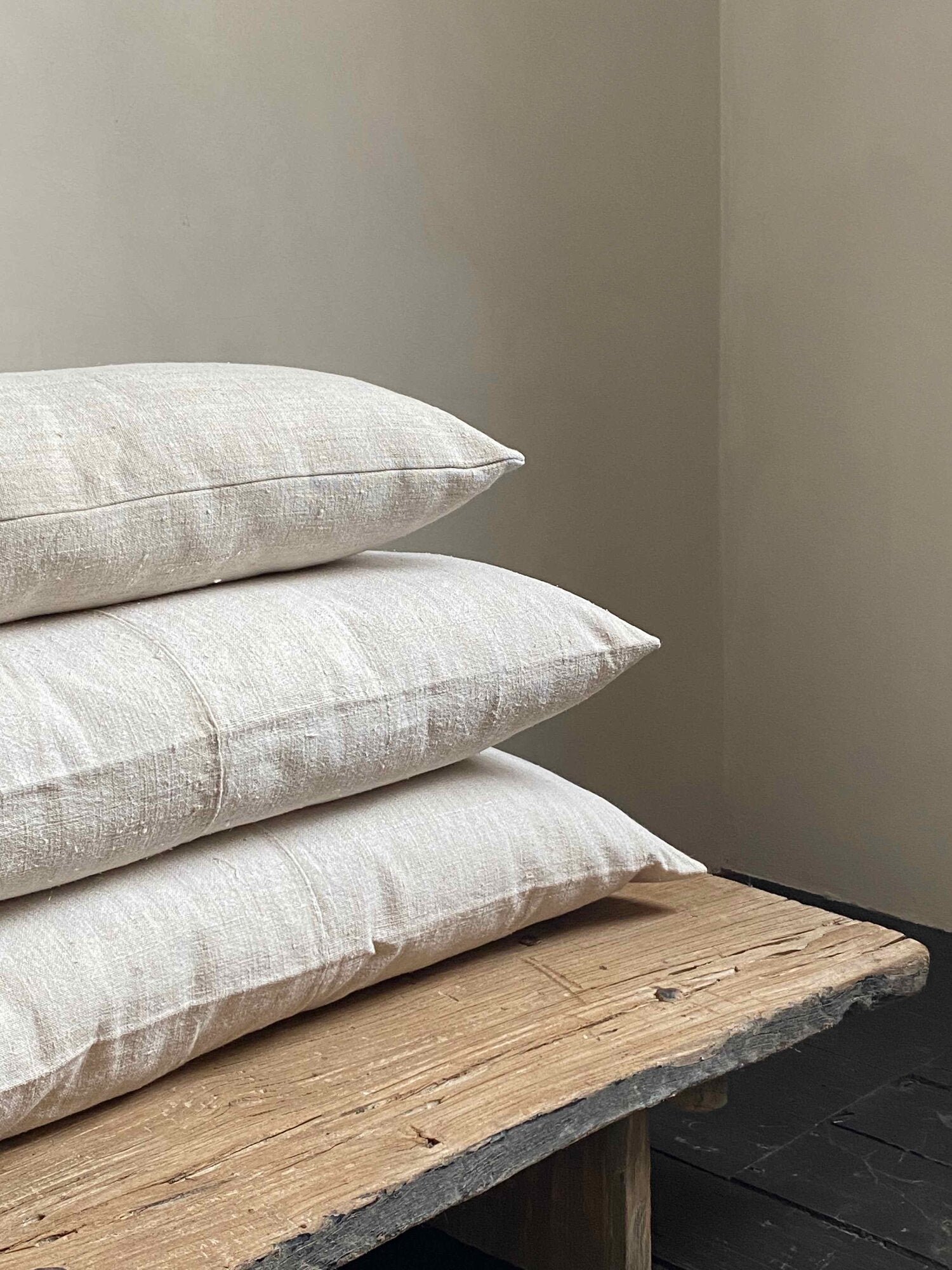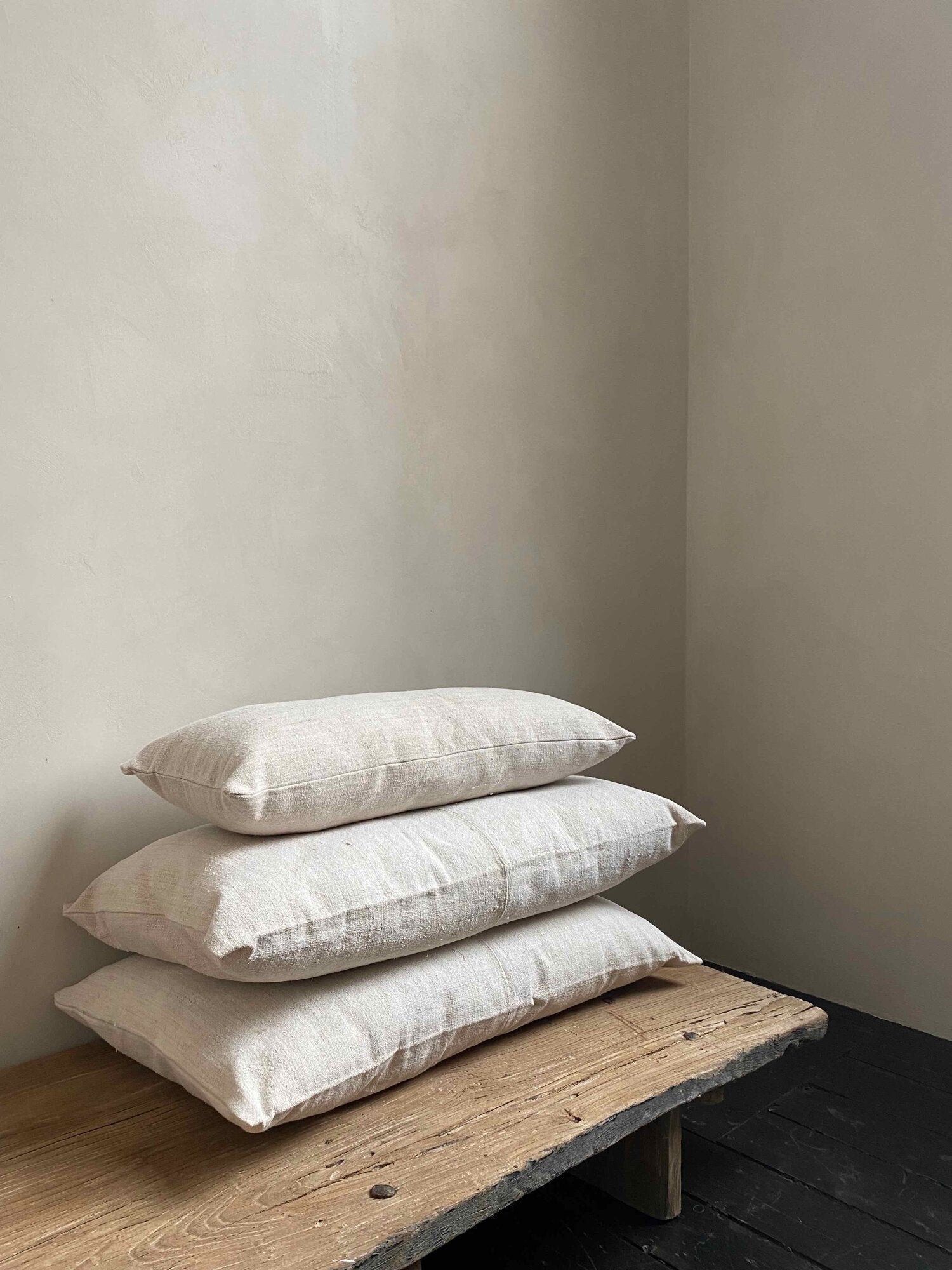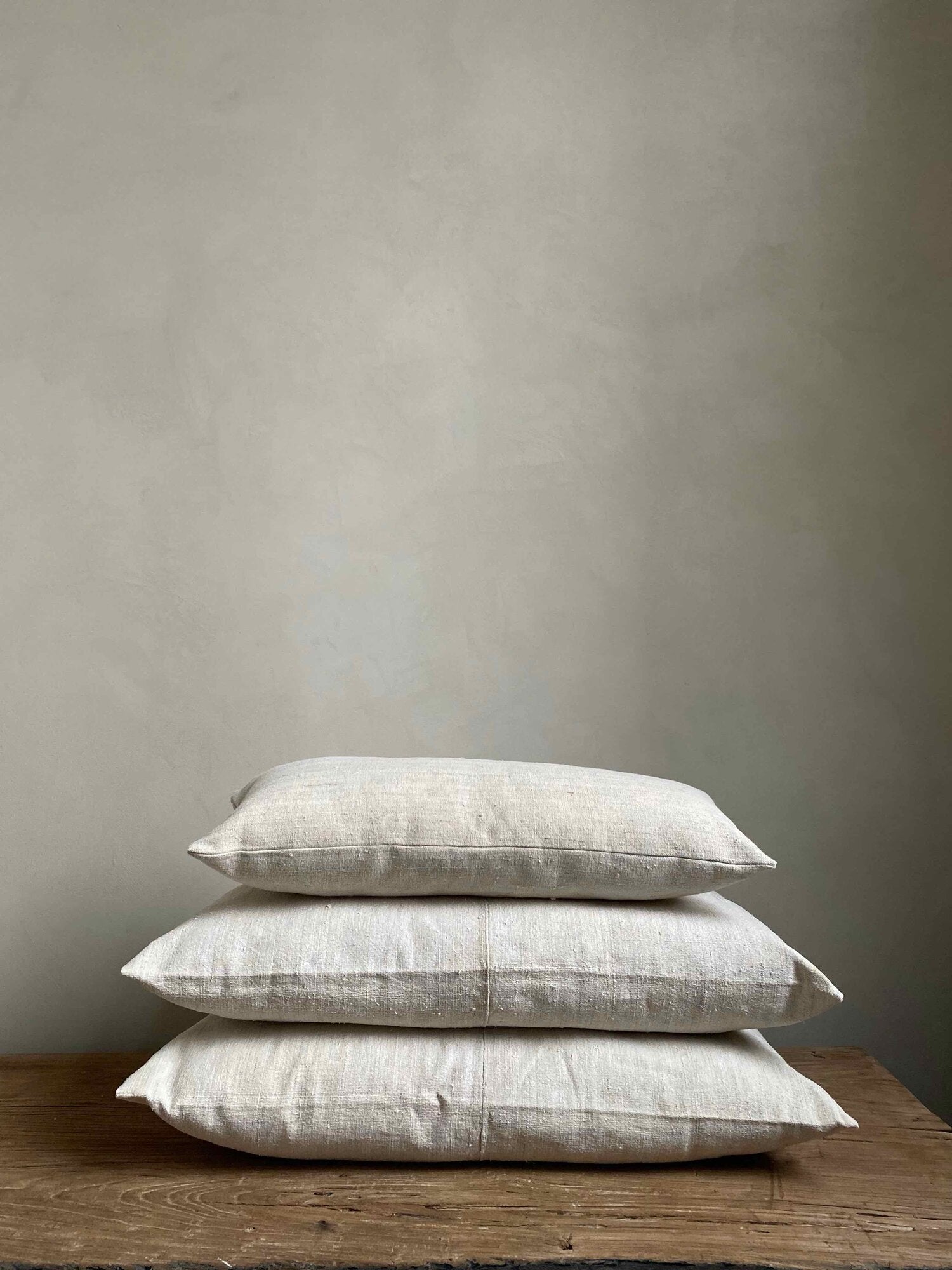 Up cycled vintage hemp cushion with central stitching. Series of two available. Pricing indicative of one cushion