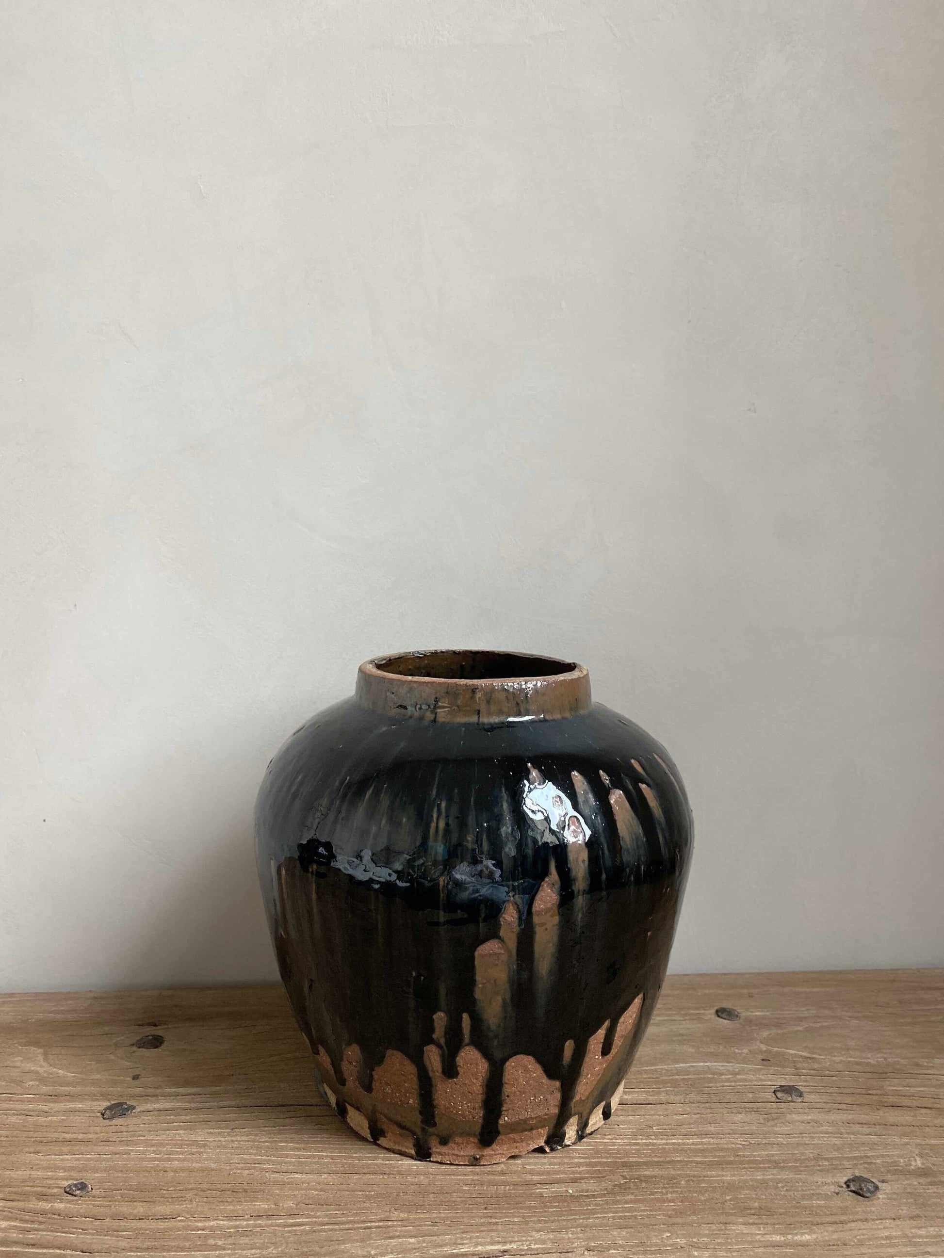 This dark glazed pot is from Shanxi province in China. It has an unglazed base. The pot is partly glazed with drips adding to it’s beauty. Circa 1900.