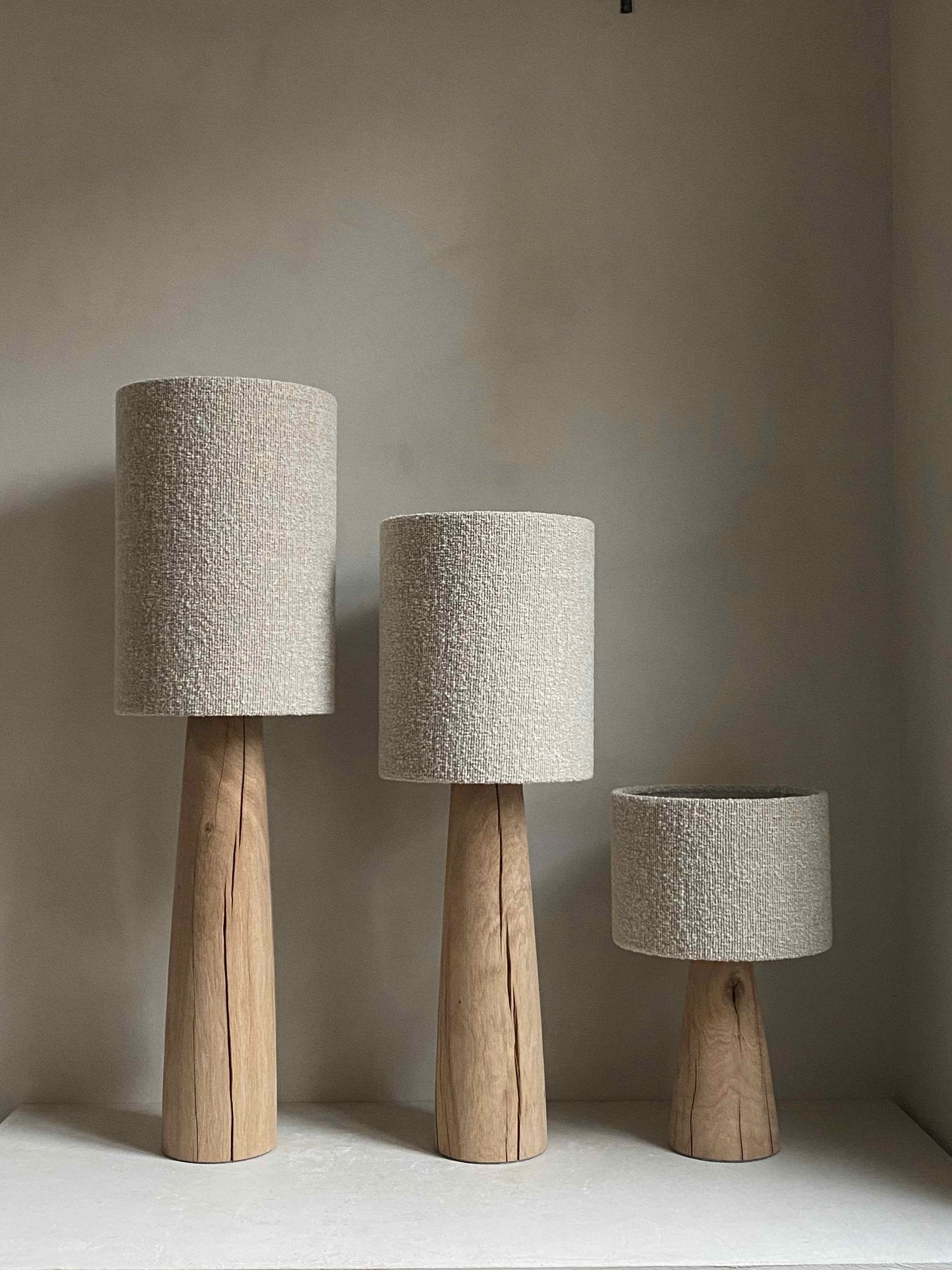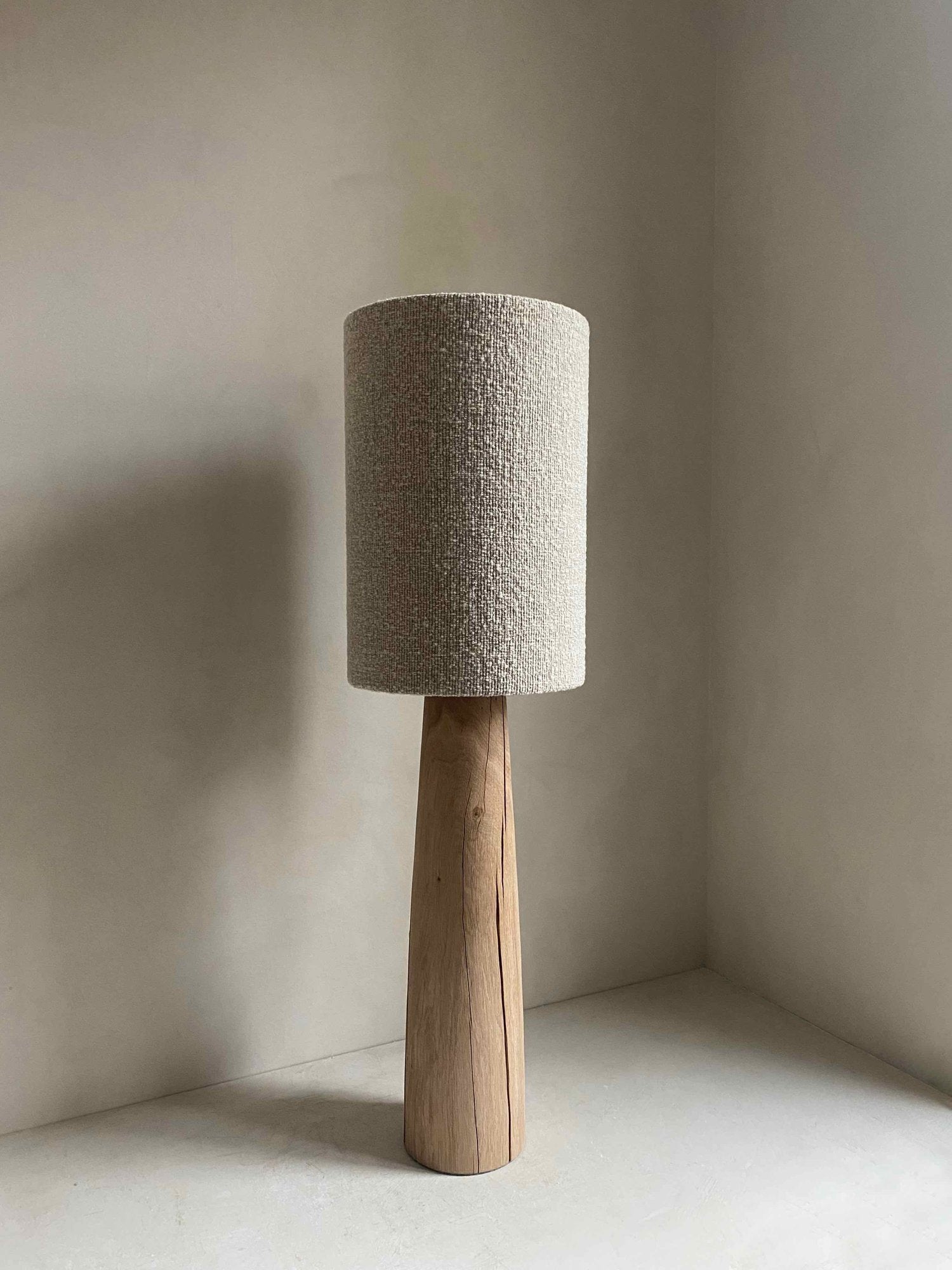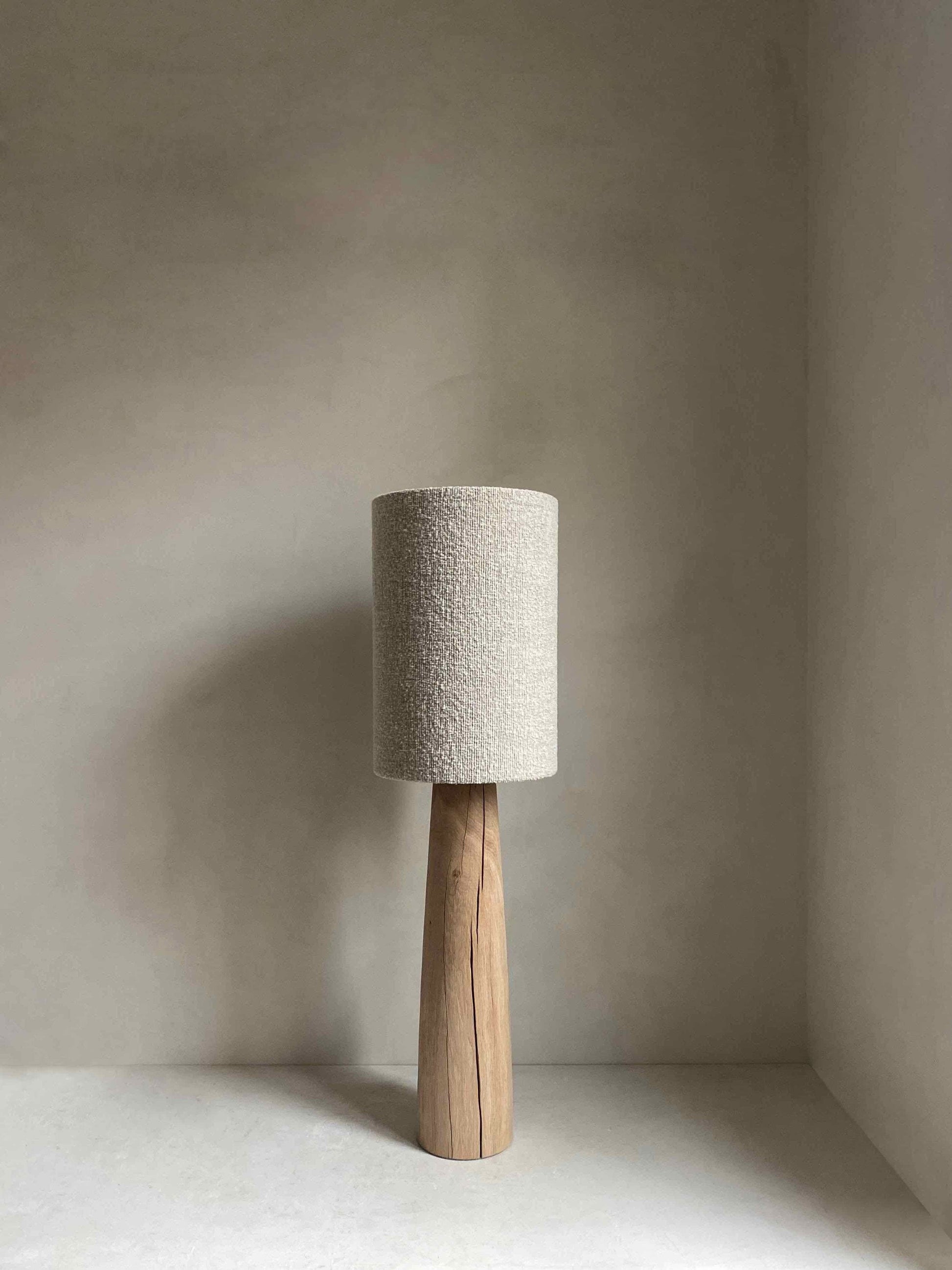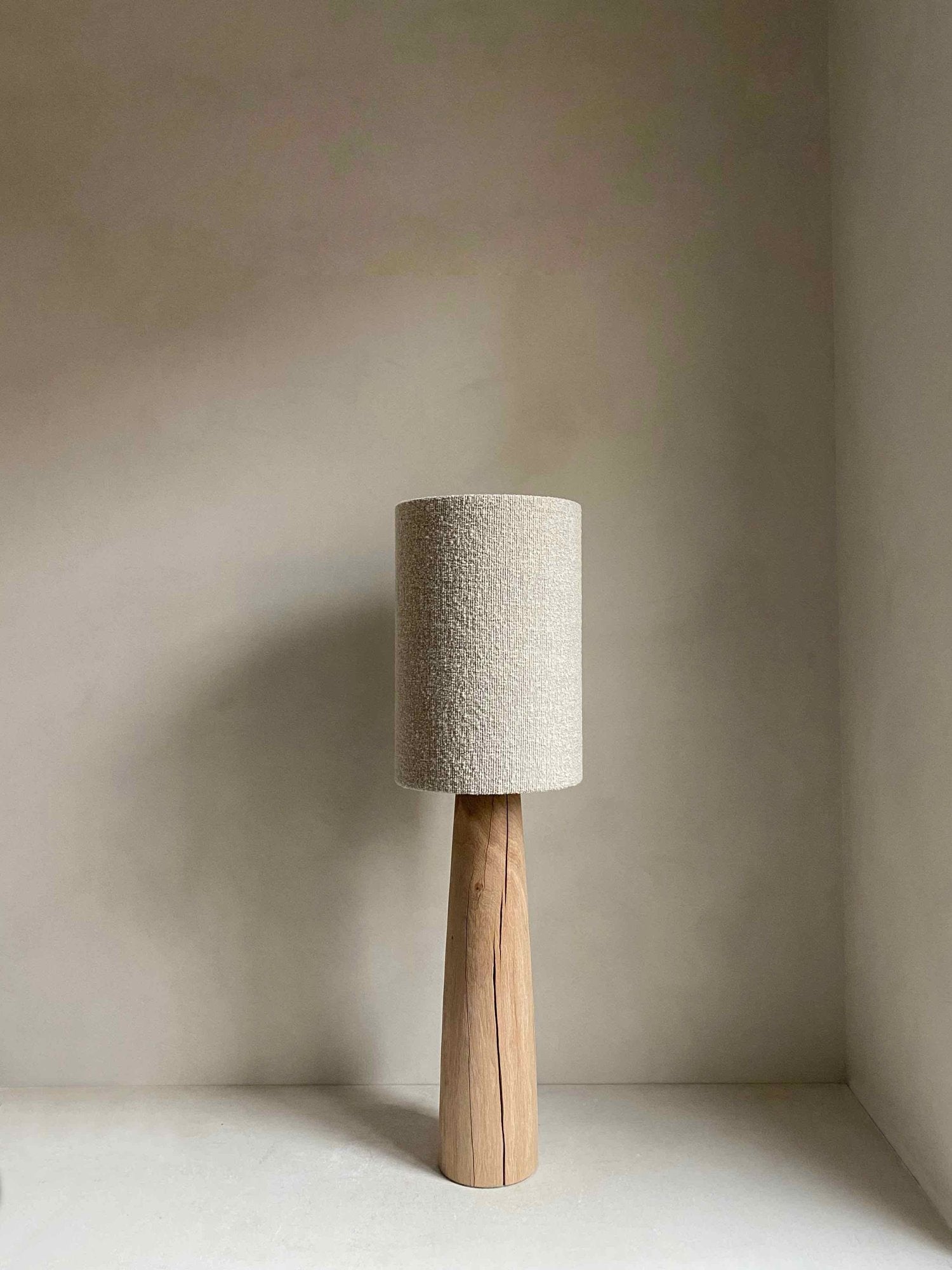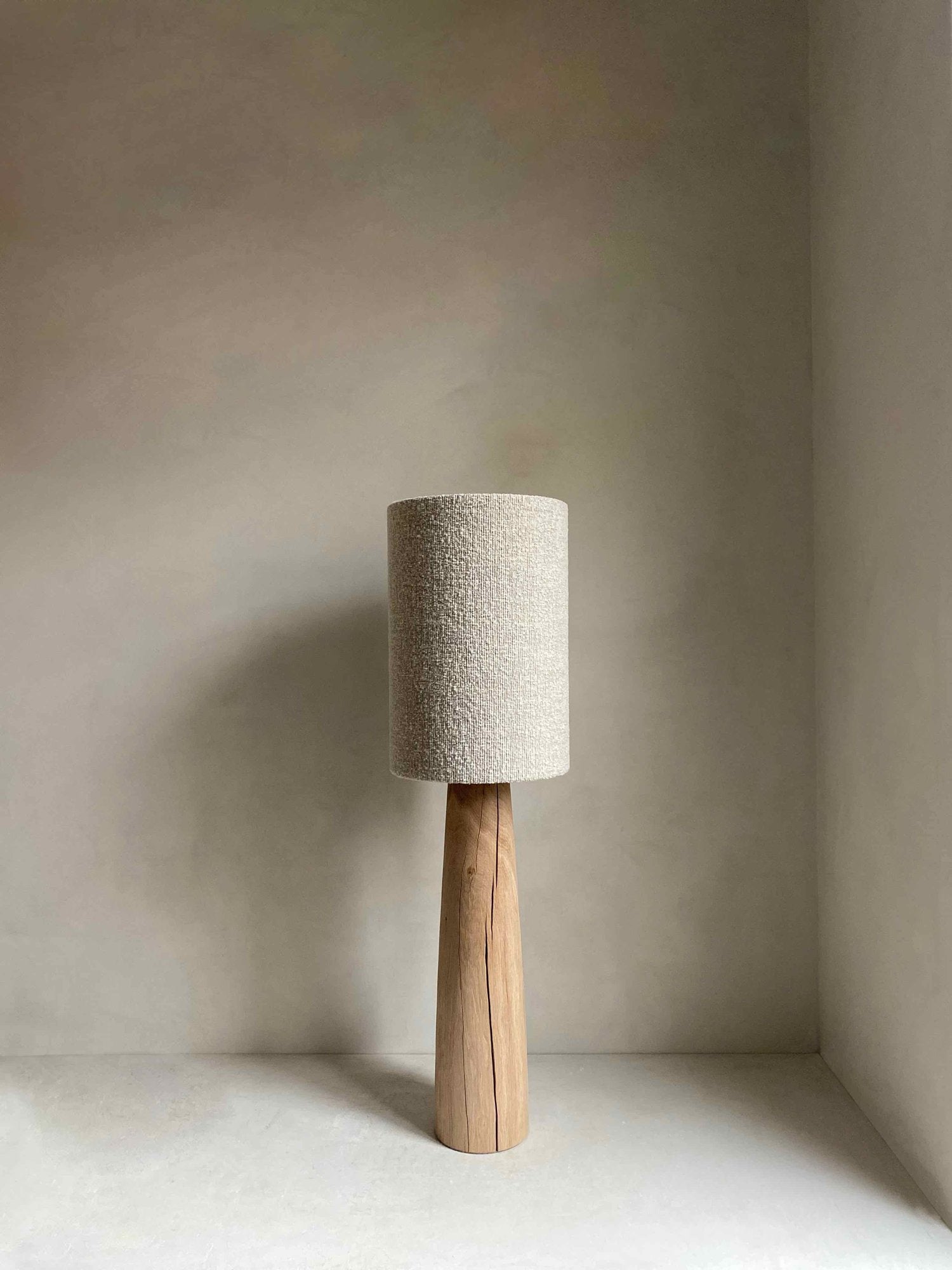 Hand turned cone lamp in French oak beautifully combined with a roughly textured linen and wool lamp shade.