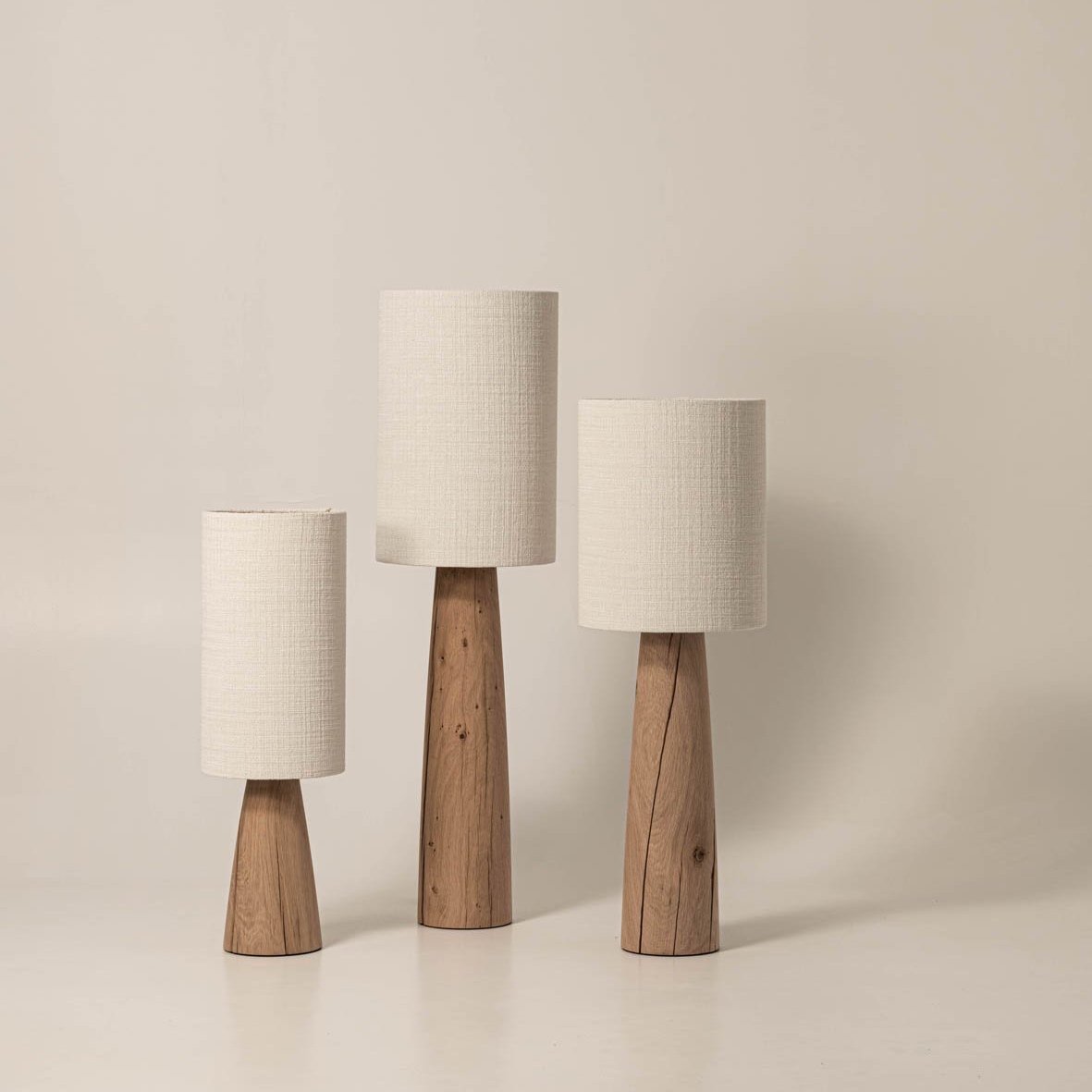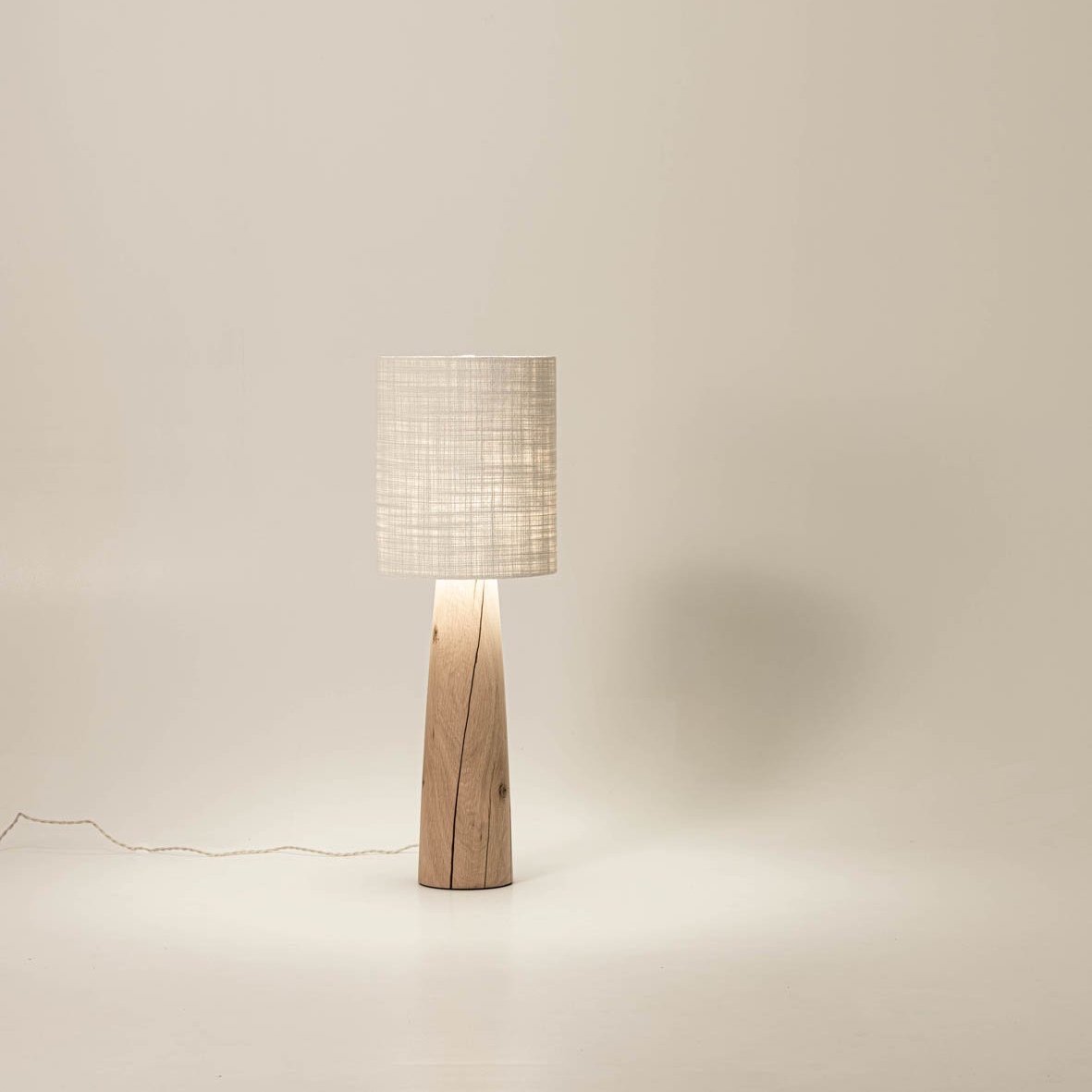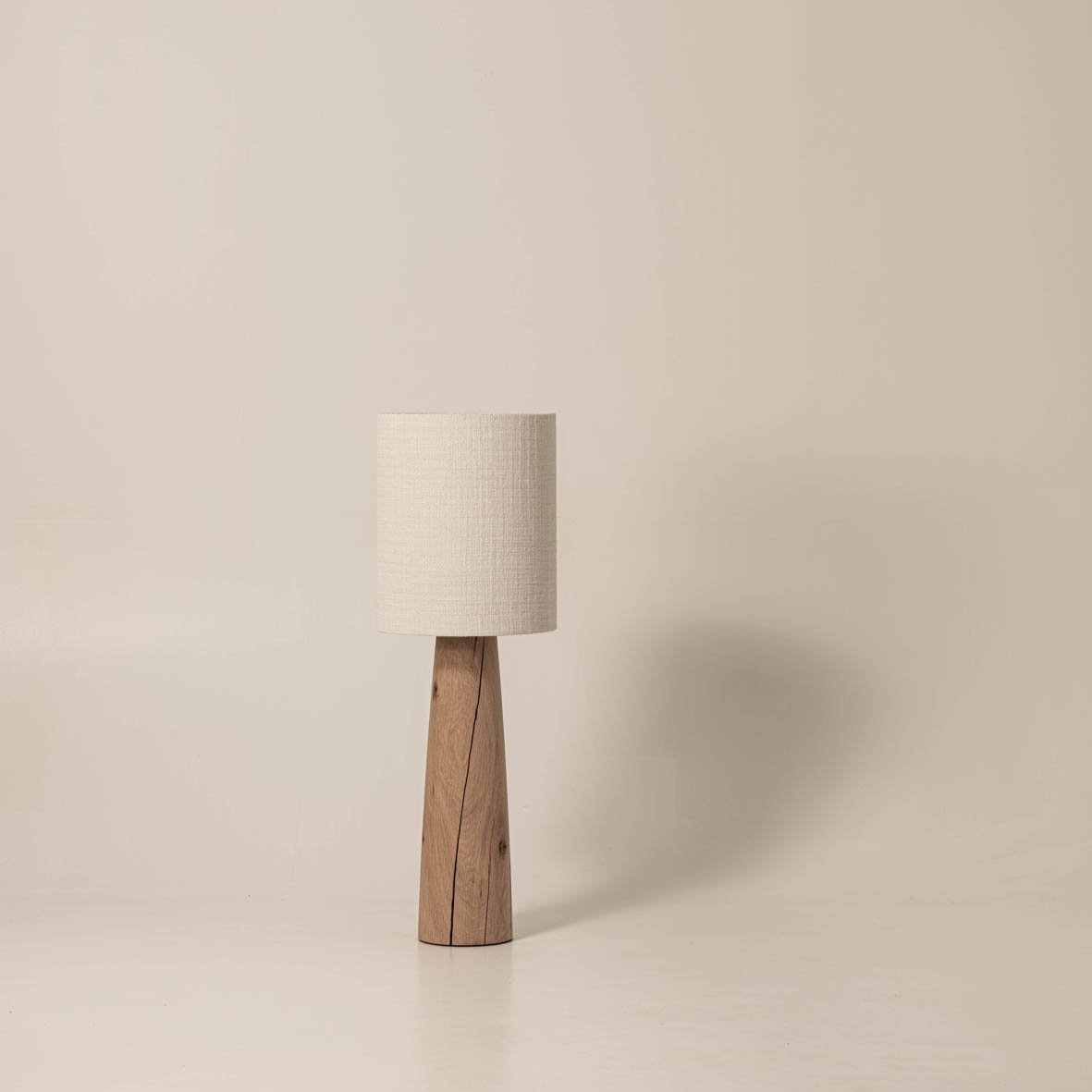 Hand turned cone lamp in French oak beautifully combined with a roughly textured linen lamp shade.