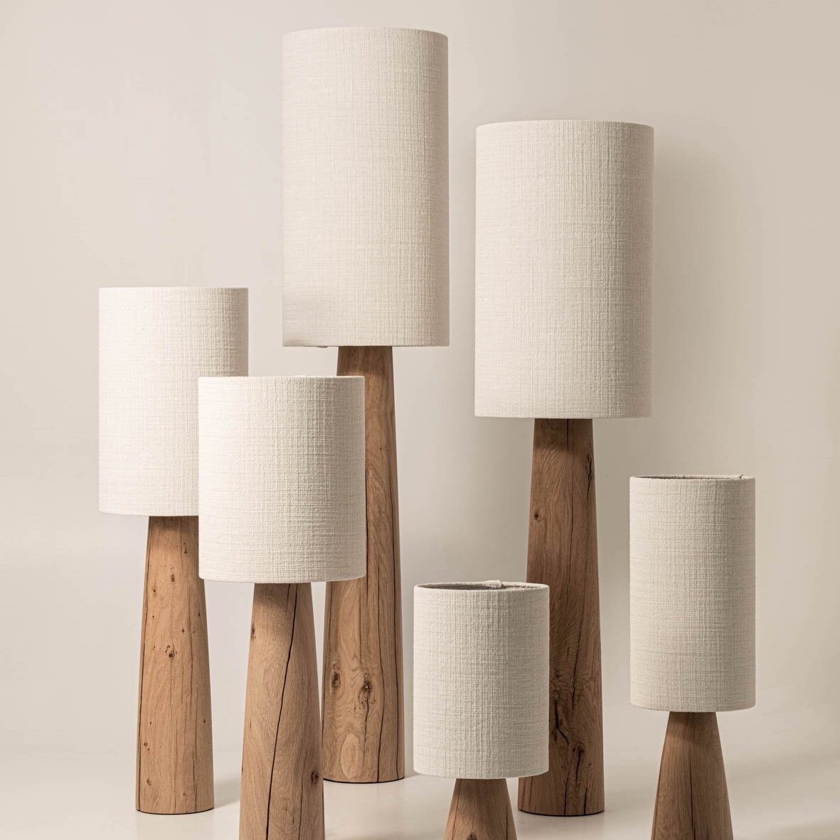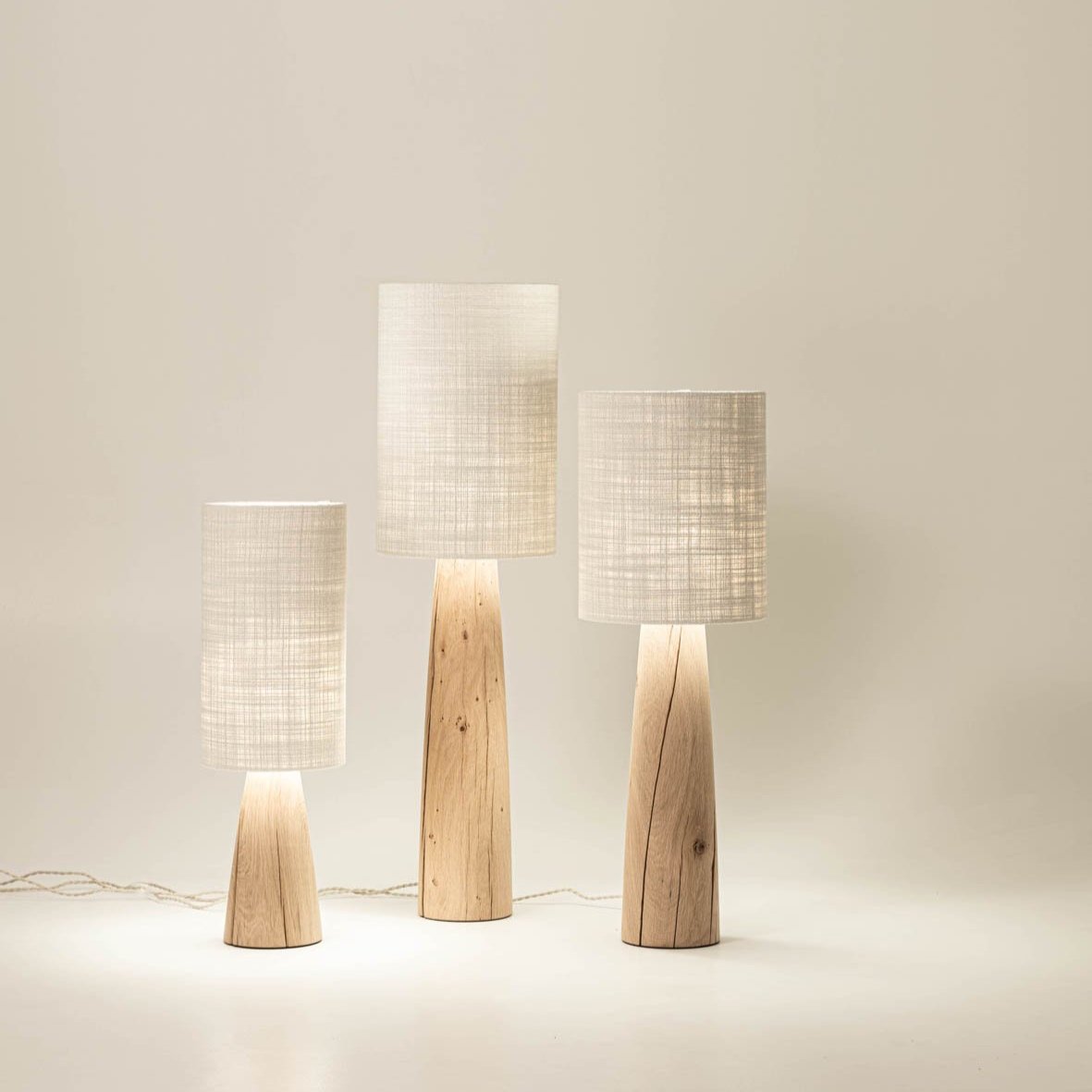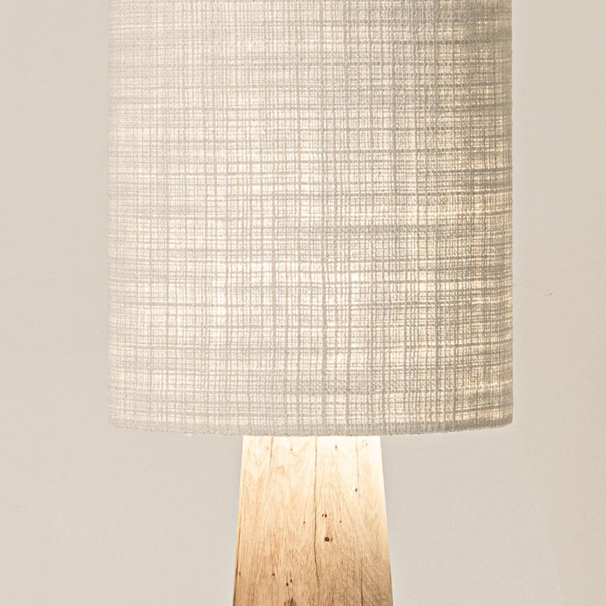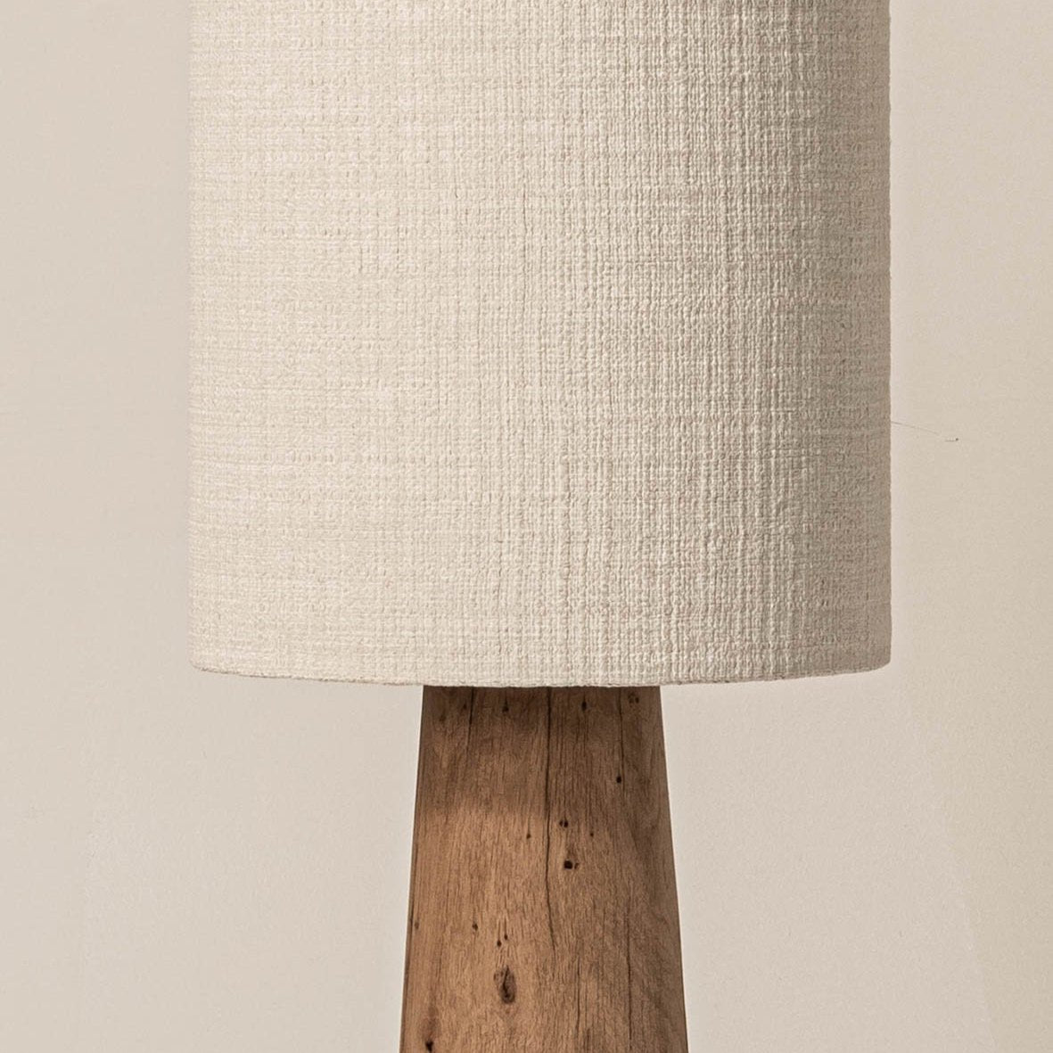 Hand turned cone lamp in French oak beautifully combined with a roughly textured linen lamp shade.