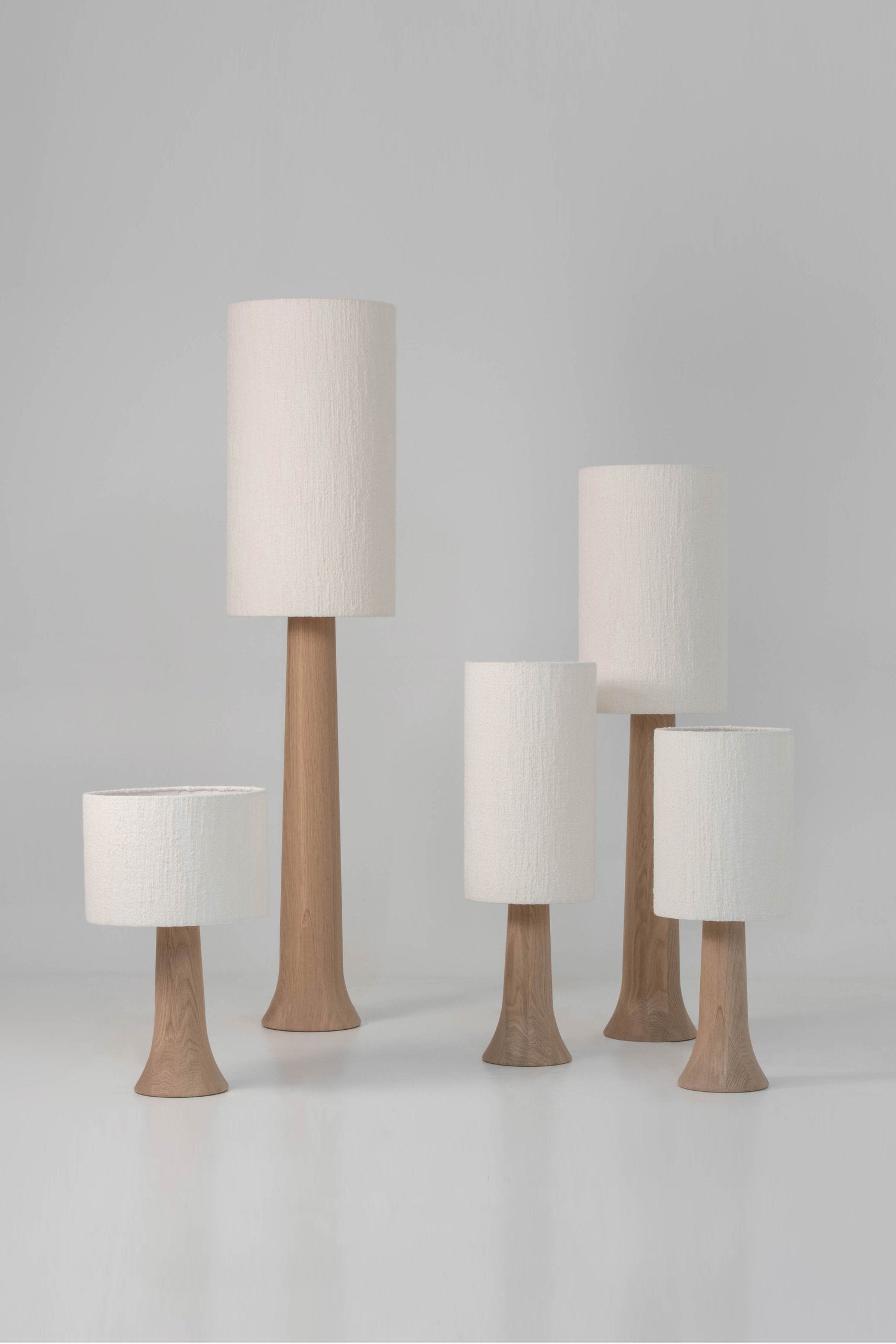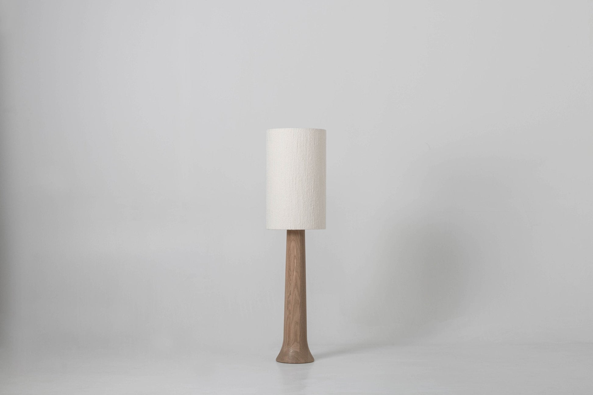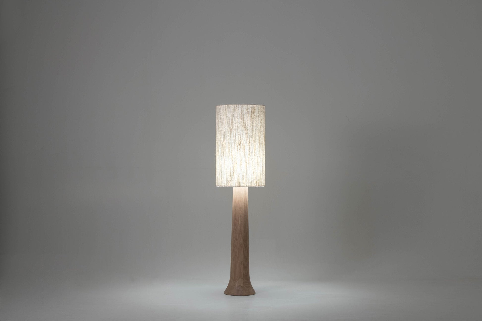 Hand turned cone lamp in French oak beautifully combined with a roughly textured linen and wool lamp shade.