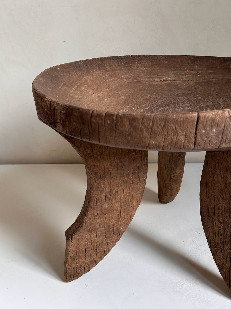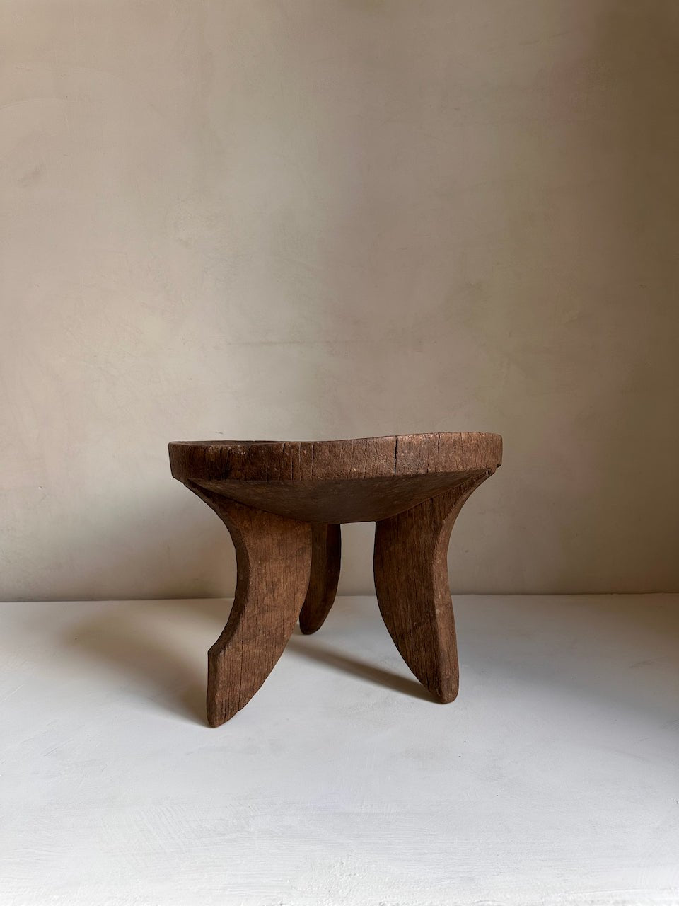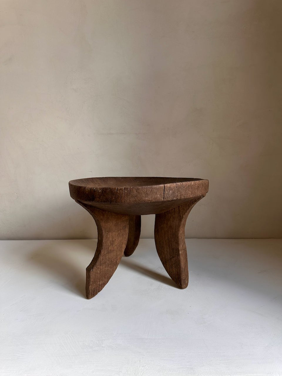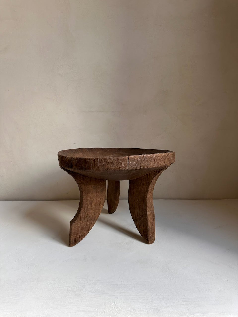 This antique stool is carved from a single piece of indigenous hardwood by the Oromo people of Ethiopia. It features a gently curved seat and a beautifully aged patina, reflecting traditional craftsmanship and cultural heritage.