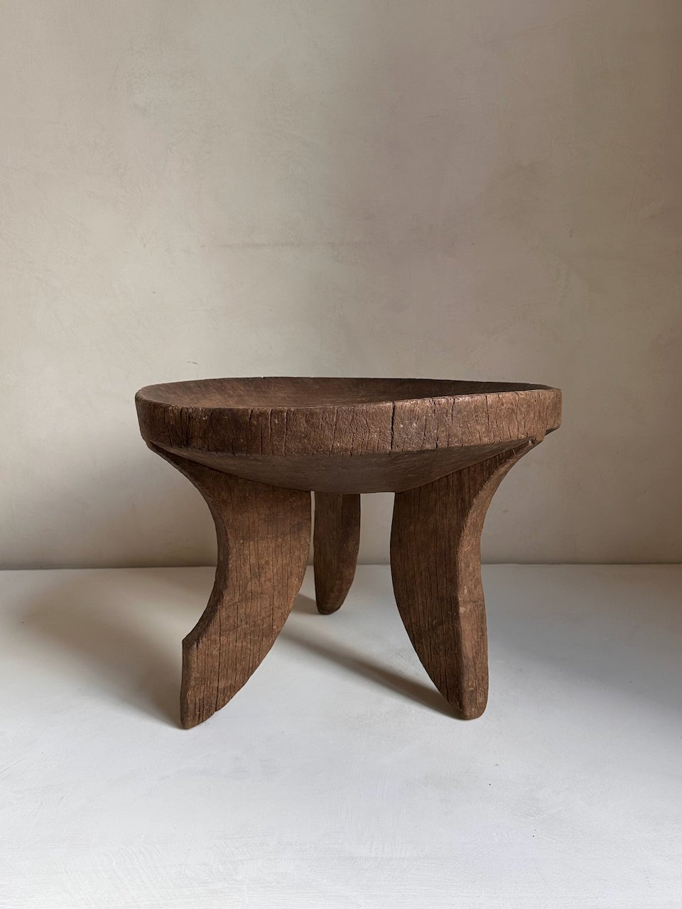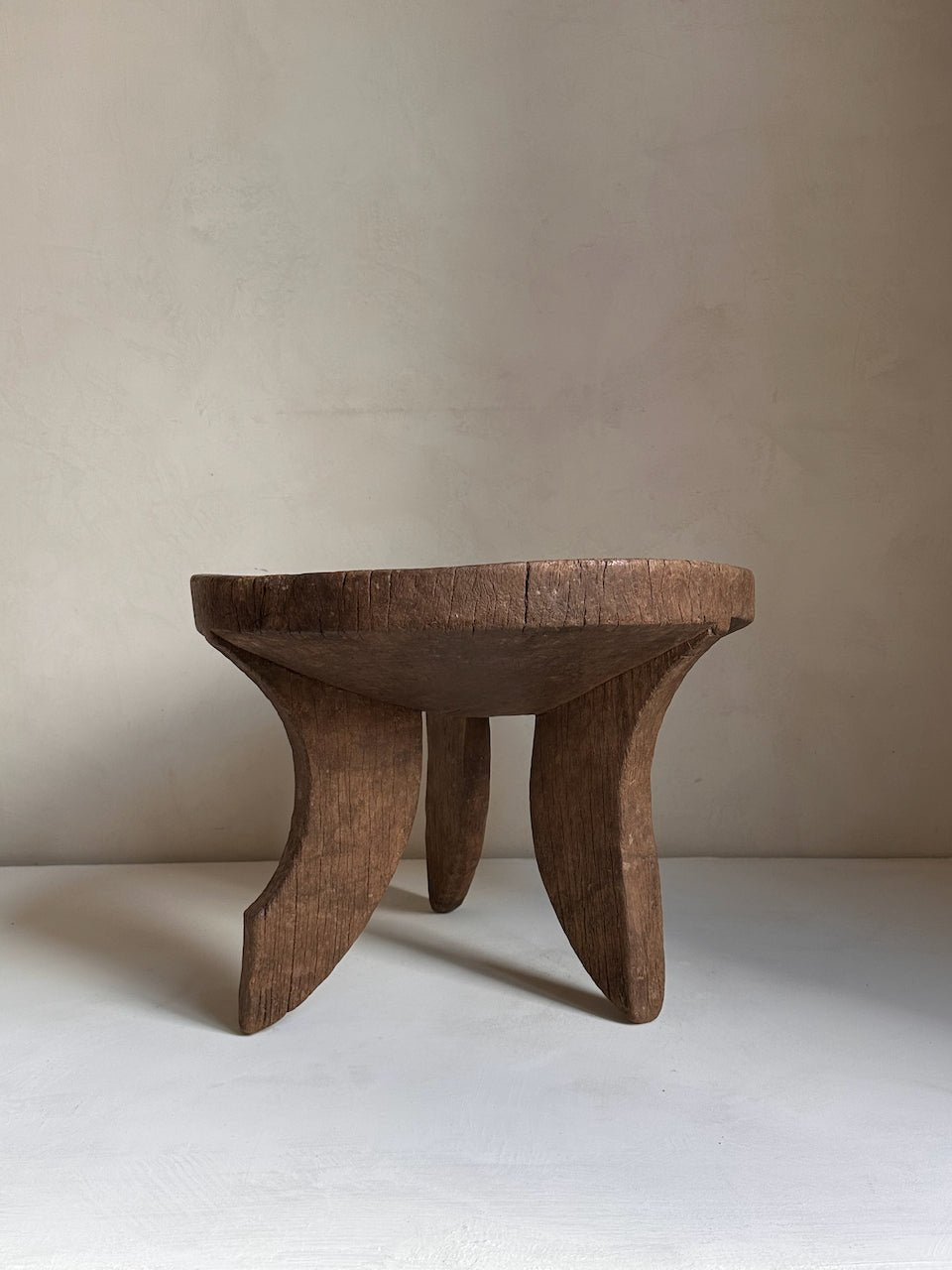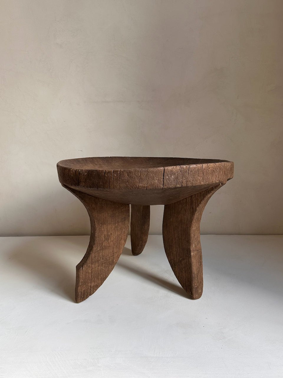 This antique stool is carved from a single piece of indigenous hardwood by the Oromo people of Ethiopia. It features a gently curved seat and a beautifully aged patina, reflecting traditional craftsmanship and cultural heritage.