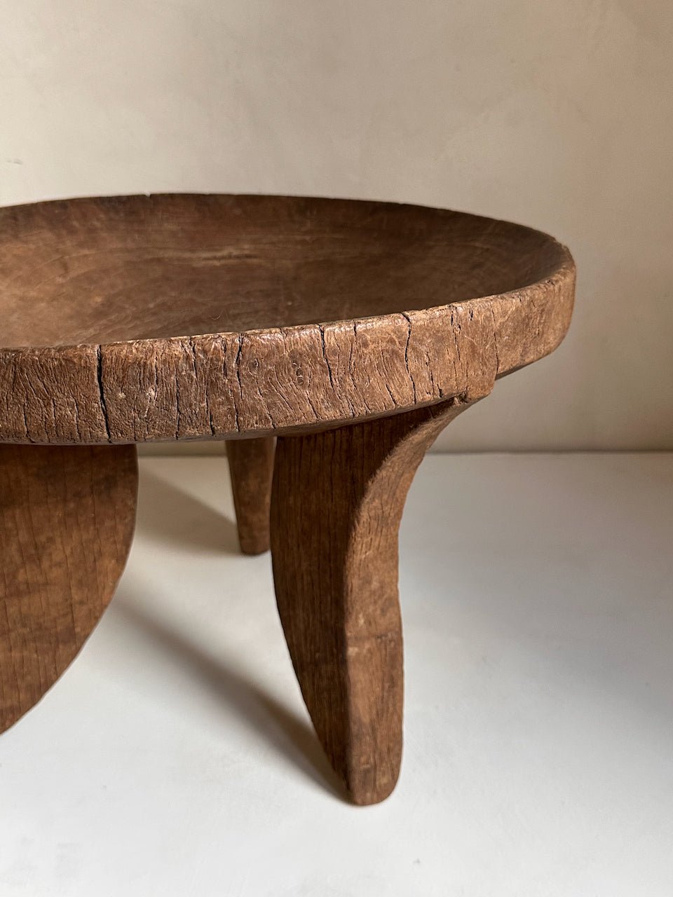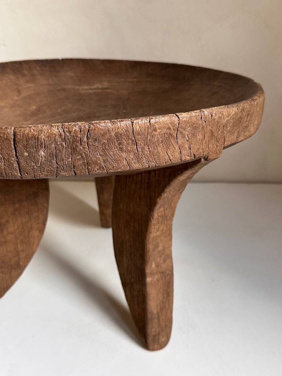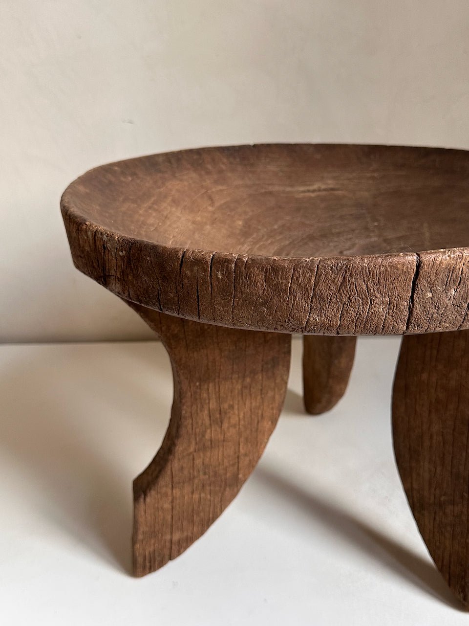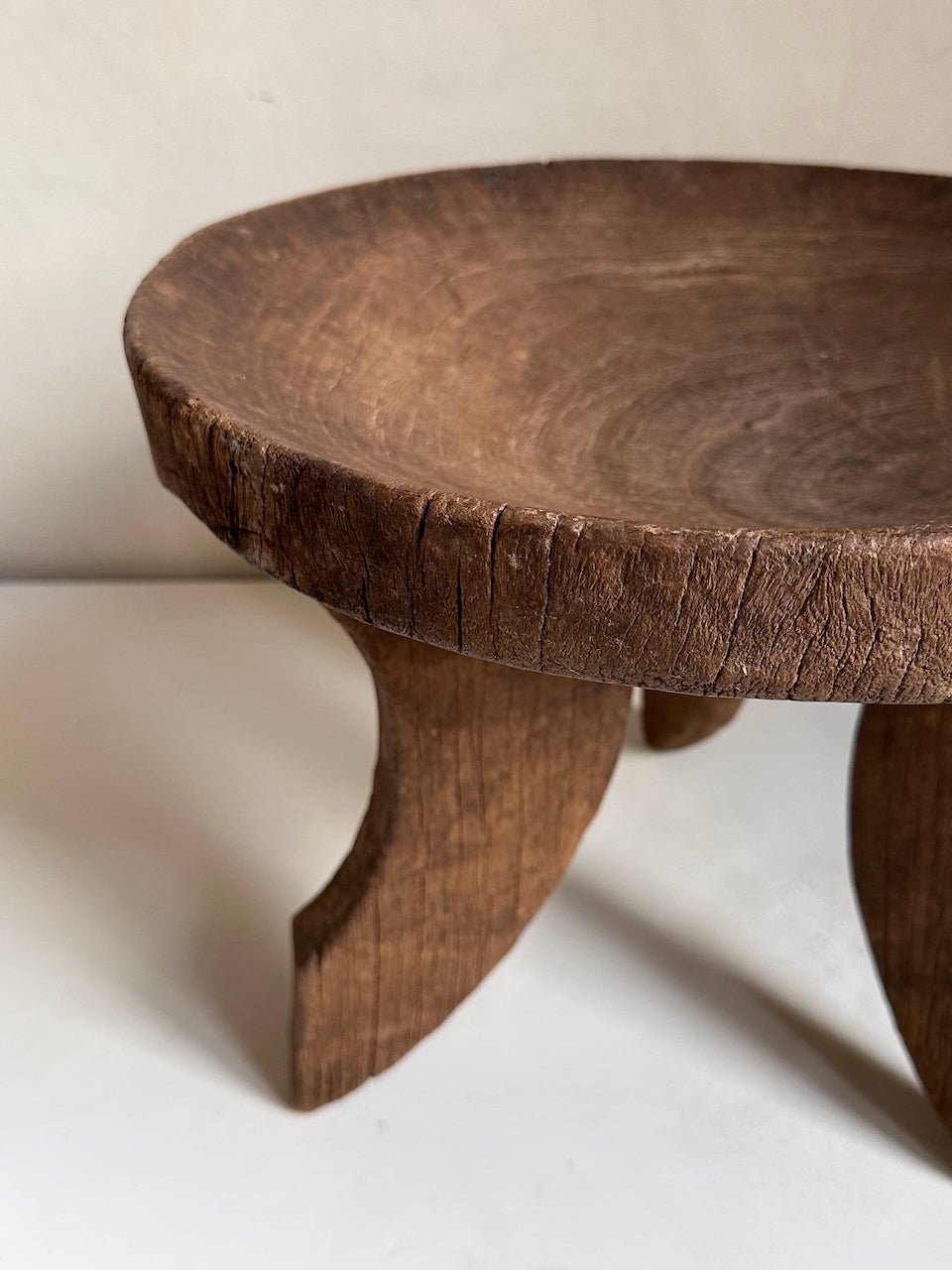 This antique stool is carved from a single piece of indigenous hardwood by the Oromo people of Ethiopia. It features a gently curved seat and a beautifully aged patina, reflecting traditional craftsmanship and cultural heritage.
