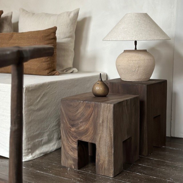 They are hand made in solid Suar wood. Cracks will appear in the wood over time adding to it’s rustic appeal.