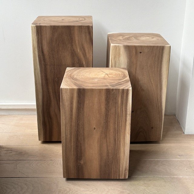 They are hand made in solid Suar wood. Cracks will appear in the wood over time adding to it’s rustic appeal. Colour variations are to be expected in these pieces.