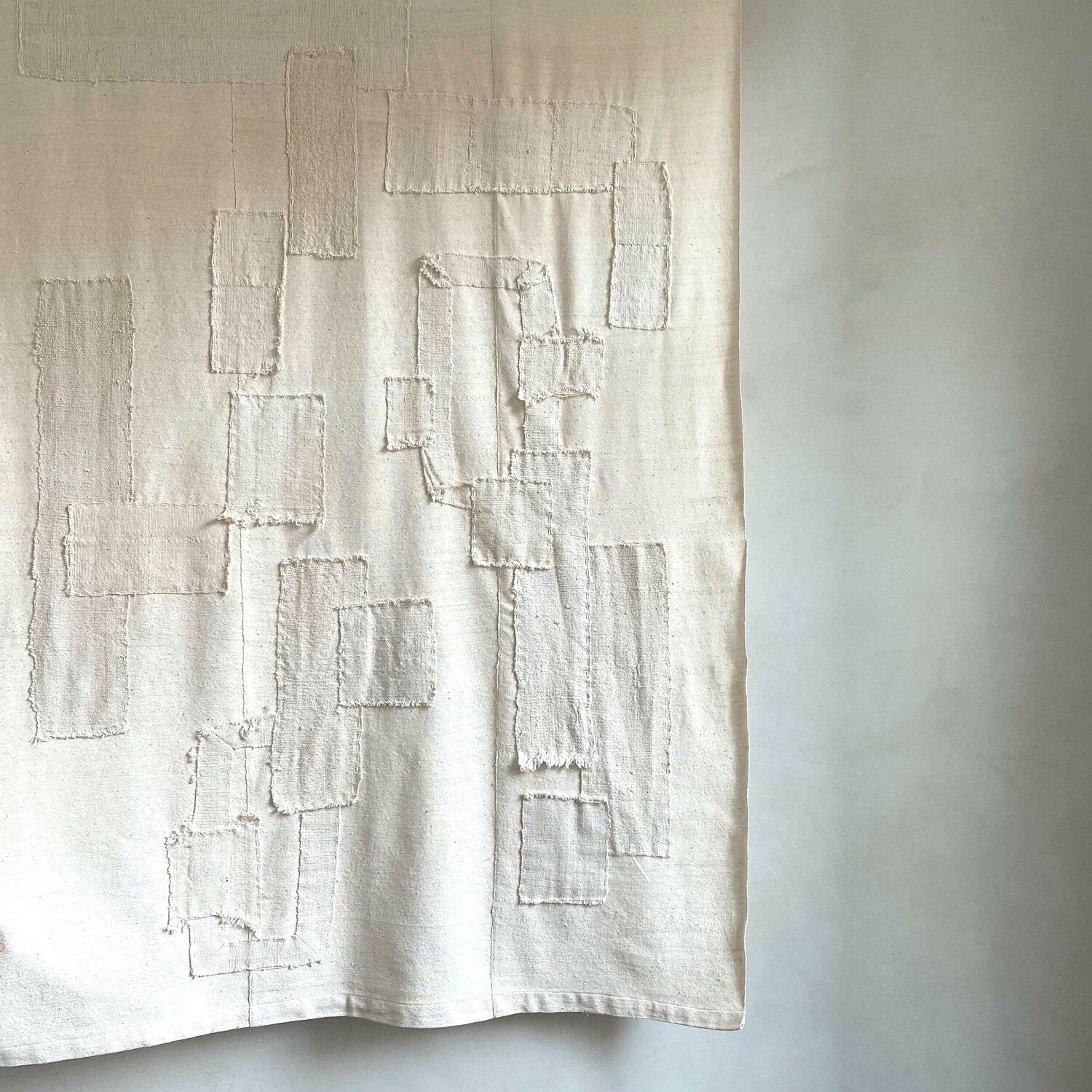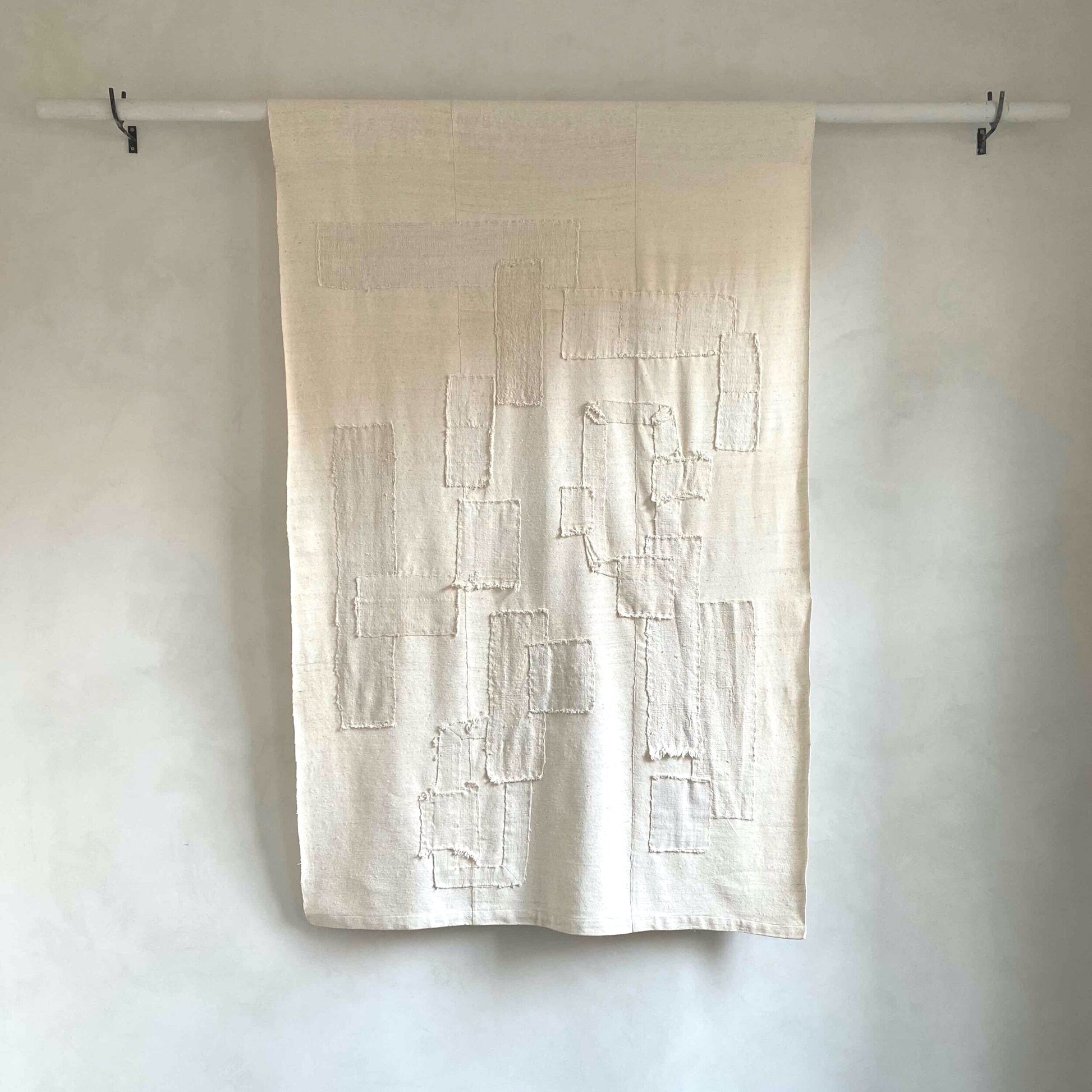 Wall hanging made with cotton bands handwoven in Mali. Andrea uses pieces of left over fabric which are hand sewn onto a cotton backing to create these patchwork textile pieces.
